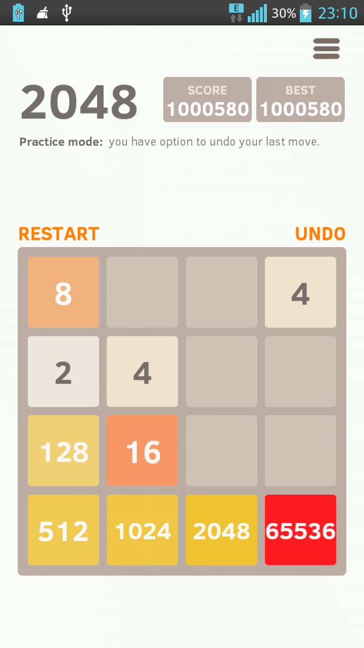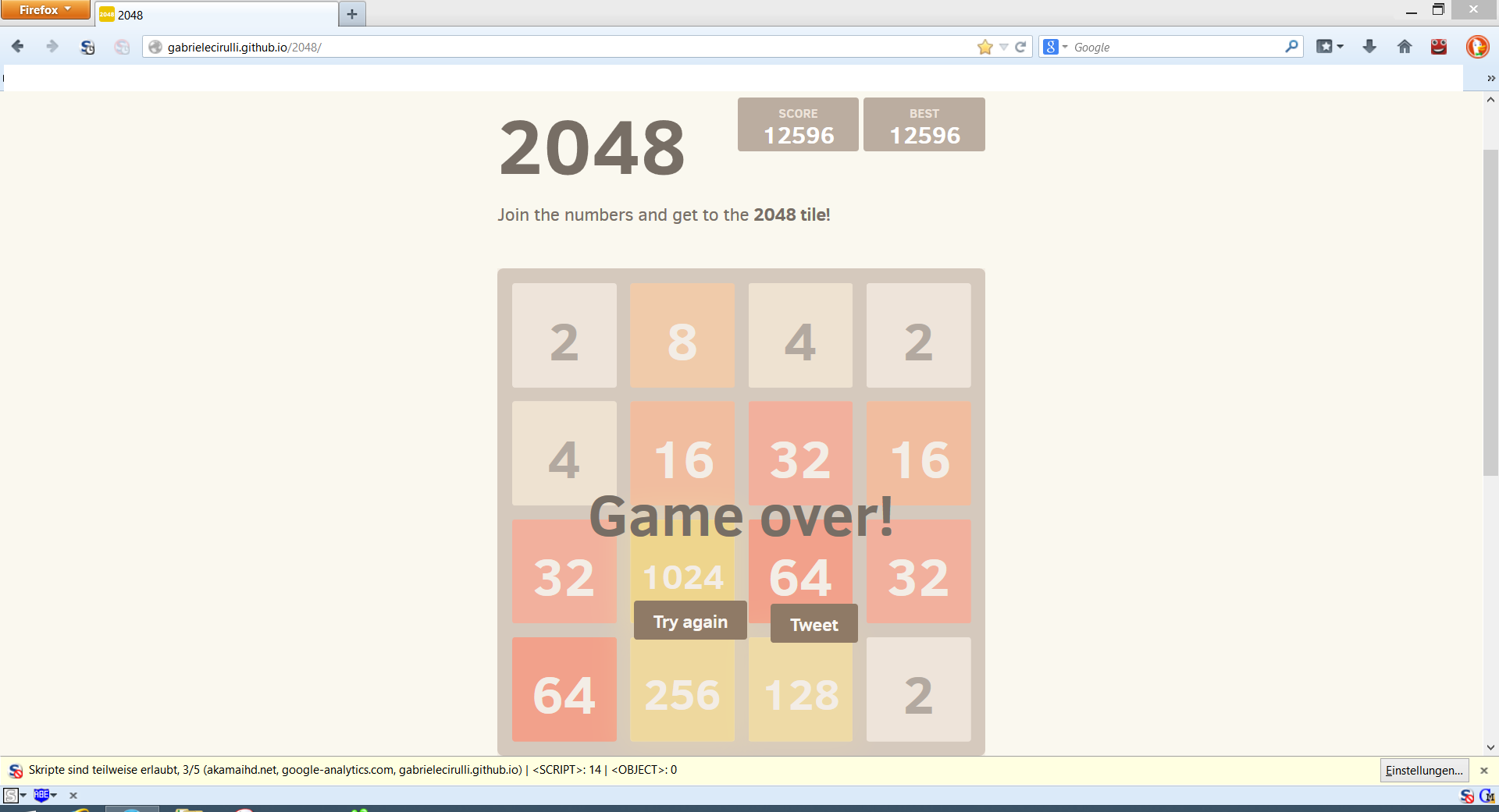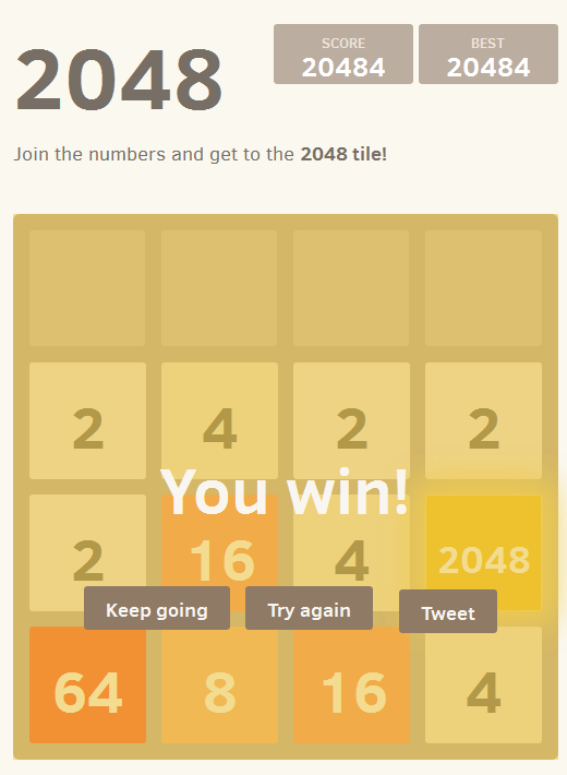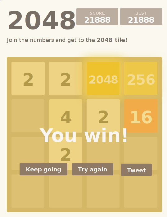 Enorme Suchtgefahr. Nach unzähligen Versuchen und nachdem ich bereits mehrmals 2 1024er-Kacheln hatte, hat es dann doch mal geklappt. Yeah!