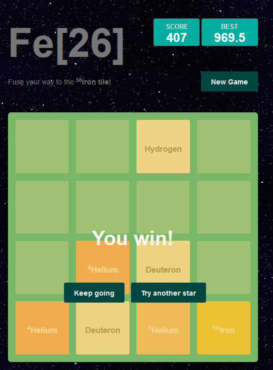 Sehr schön ist auch die Fe26-Variante, bei der man ausgehend von Wasserstoff versuchen muss Eisen zu erzeugen/fusioniern. newbrict.github.io/Fe26/ Hmm irgendwie funkt der Link nicht richtig