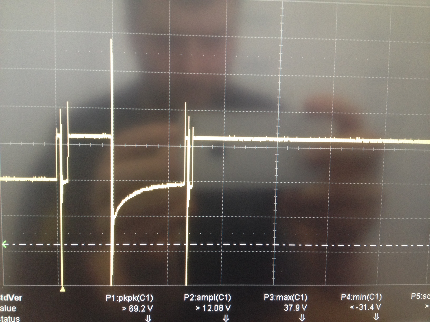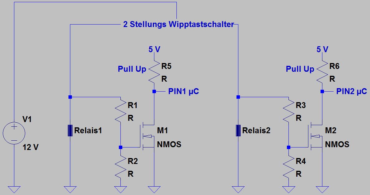 Hallo Zusammen, ich polle mit meinem dsPIC30F6012 zwei seiner PINs auf einen negativen Eingang um den Zustand von einem elektropneumatischen Wegeventil abzufragen. Relais 1 bzw. 2 stellt den Zustand des Relais dar. Wird der Taster auf eine Stellung gedrückt, zieht das jeweilige Relais an und schaltet dazu noch einen Mosfet. Der Mosfet schaltet den Eingang des µC auf Masse um somit den Low Pegel zu erreichen. Der Taster ist bereits per Software entprellt, die Entladung der Spule macht mir aber noch Probleme... Anbei die Schaltung und eine Aufnahme mit dem Oszi eines kurzen Tastendrucks. Die Kontakte bei der Aufnahmen wurden am Gate des Mosfets und an Masse angeschlossen. Meine Idee wäre jetzt die Spannung vllt. über ein RC Glied, parallel zum Relais zu glätten. Was haltet ihr von der Idee, bzw. habt ihr andere Vorschläge den Zustand des Relais abzufragen? Beste Grüße