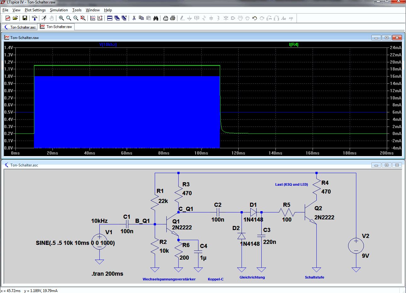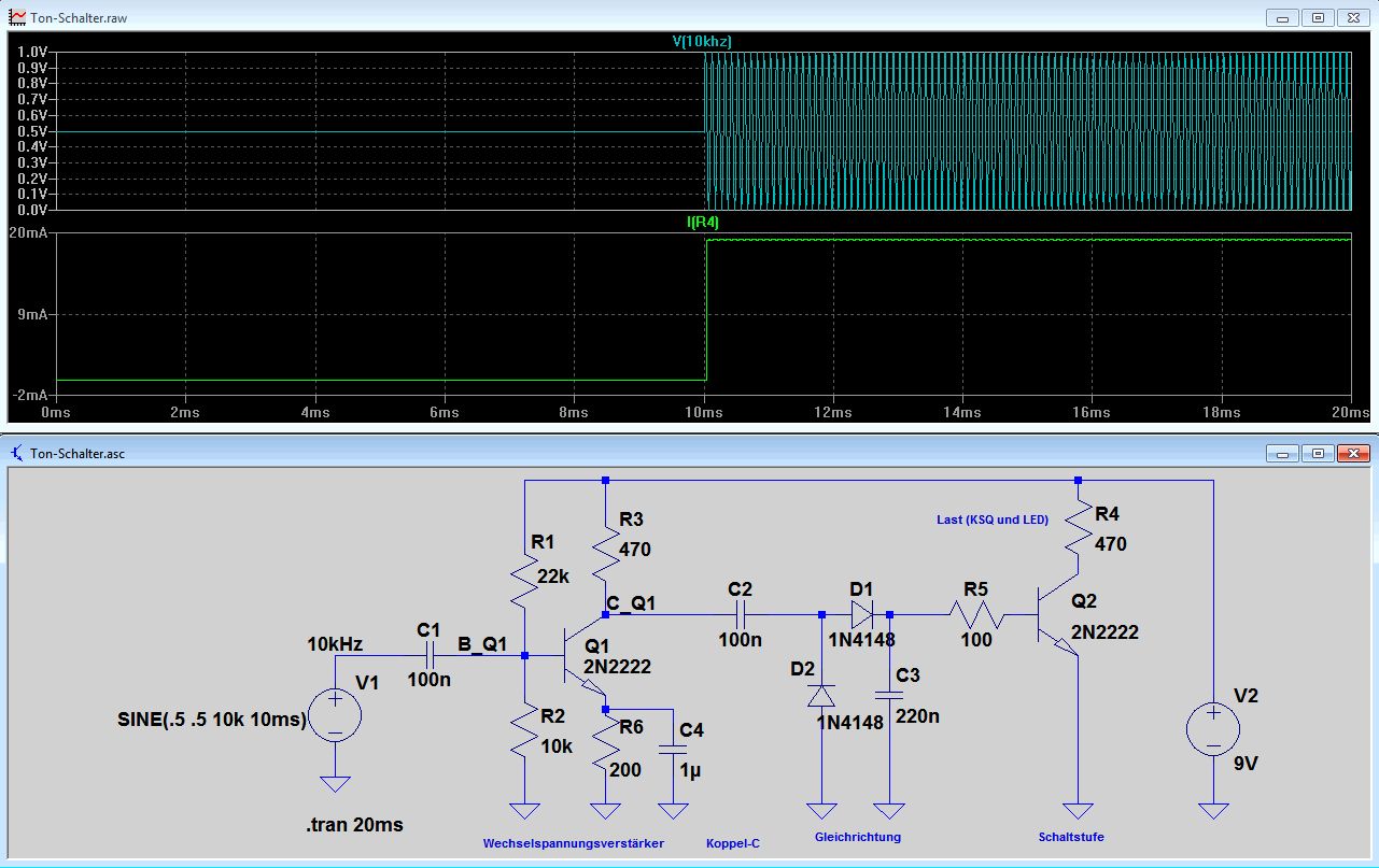 Gar nicht so schwer. Ich hab alles mal noch ein wenig "auseinander gezogen" und Kommentare (blau) rangeschrieben. Über C1 koppelst du die 10kHz auf eine Transistorstufe. Am Kollektor koppelt man die verstärkte Wechselspannung aus mit C2 und richtet sie gleich (D1, D2), danach eine kleine Glättung (C3). Damit hast du schon eine Gleichspannung, die über R5 zum Basisstrom für Q2 wird, um den durchzusteuern. Und der schaltet dann deine LED/KSQ gegen GND. Das ist alles.