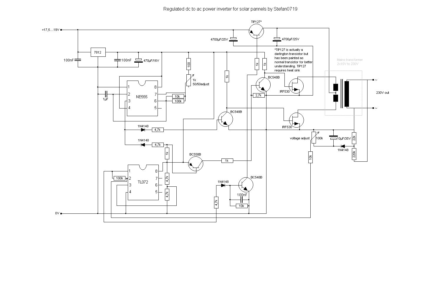Hallo, ich habe mir einen Wechselrichter gebaut. 2x IRF530 für die Sekundäre Seite vom Trafo, und einen TIP127 an die Mittelanzapfung. Dazu als Takt einen NE555 und einen TL072 der mir die IRF530 s reglet. Nun habe ich max. 40-50W Out ohne das mir die Spannung eibricht. Den TIP127 der an der Mitelanzapfung des Trafos ist, möchte ich gegen einen IRF5305 ersetzen. Nun muss ich ja zwischen Gate und Source einen Pulldownwiederstand einbauen, damit der Mosfet nachgeregelt wird. Jetzt stellt sich bei mir die Frage, wie große muss dieser sein?