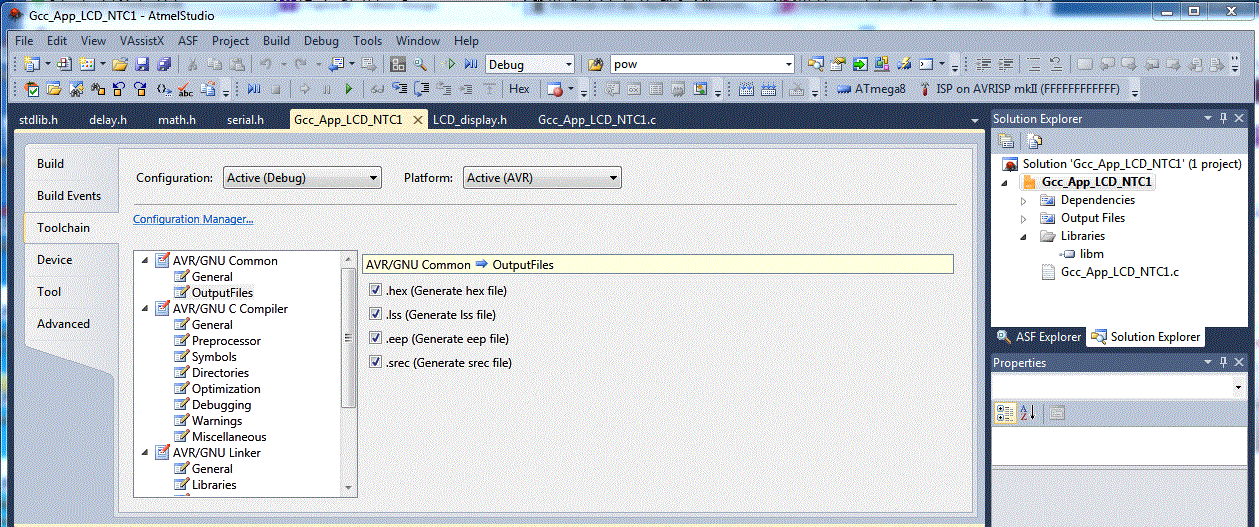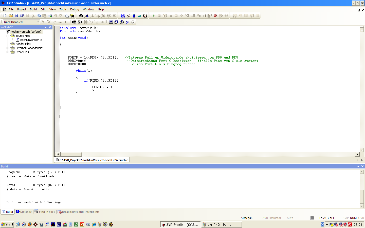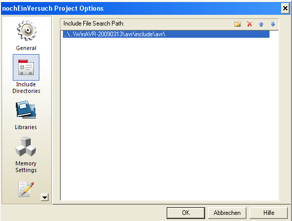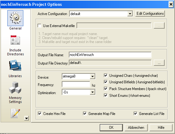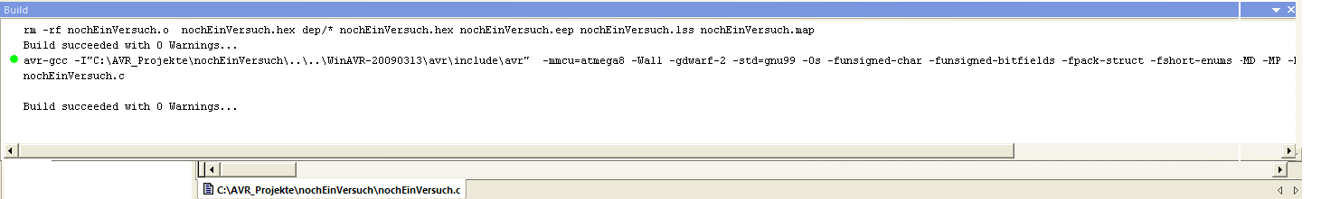 Hallo! Ich habe grade angefangen meinen verstaubten Rechner mit AVR Studio 4.18 auszupacken.... Ein kleines Testprogramm habe ich schon. nun eine Grundsatzfrage: Ich verwende im AVR Studio den ARV GCC und habe unter den General Einstellungen Create Hex File Generate Map File Generate List File. ausgewählt in das entsprechende Projektverzeichnis. Gege ich in den Projektordner sind da folgende Files *.aps *.aws *.c Default Ordner in diesen Default Ordner ist wiederum Makefile *.o dep Ordner in dem dep- ordner ist wiederum *.o.d file? passt das so? wo ist denn nun das .hex file? warum so viele Unterordner? was ist die .o und die o.d file? Danke für Antworten