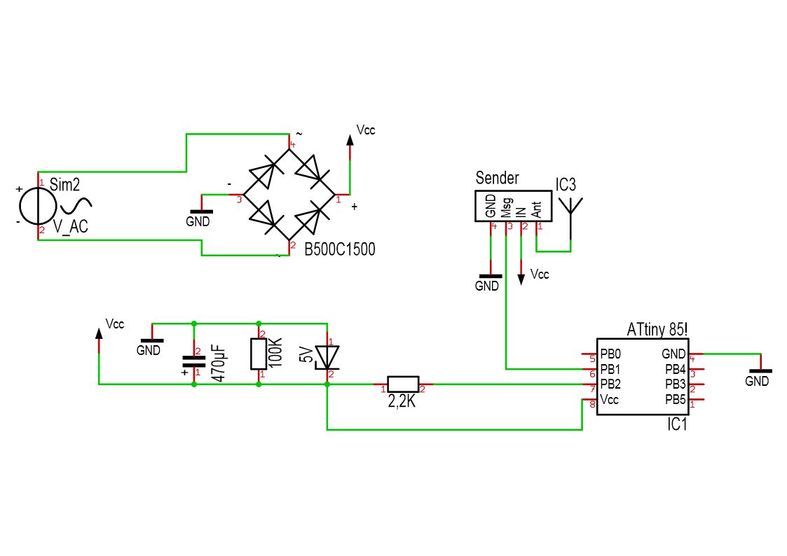 kopfkratz Also erstmal fehlt da die passende RESET Beschaltung am Tiny und der obligatorische 100nF Blockkondensator direkt am Käfer. Statt der Diodenlösung nimm lieber einen LowDrop Regler um auf stabile 5V zu kommen wobei bei 7V min Du eher zu 3,3V Versorgung tendieren solltest. Warum Du die Stromversorgung für den Tiny als Meßpunkt nimmst ist auch unklar. Wenn Du an der Klingel max 9V Wechselspannung hast, kannst Du wie geplant mit einer Diode die Spannung auf 3,3V begrenzen (wie geht das ?) und die Halbwelle zur Detektion per ADC nehmen. Die Versorgung des Tiny muß unabhängig von der Meßleitung sein. Wenn Dein Sender nur angehen soll ist das sowieso Overkill, dann kannst Du den auch direkt mit Gleichrichtungsdiode an die Klingelleitung hängen. Aber was das eigentlich soll schreibst Du ja nicht ...