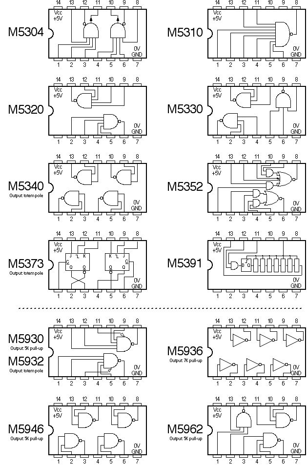 Die Pfeile symbolisieren die Emitter der Eingangs-/Ausganstransistoren nicht ganz 100%iger Ersatz für M5352 (als Beispiel für die speziellen Eingänge) http://www.panda-bg.com/datasheet/600-002225-TTL-74H53-TI.pdf Ersatz für M5304 http://www.unicornelectronics.com/ftp/Data%20Sheets/7460.pdf