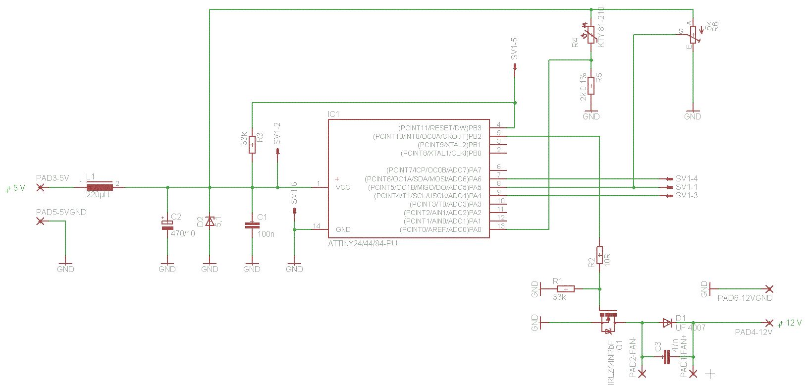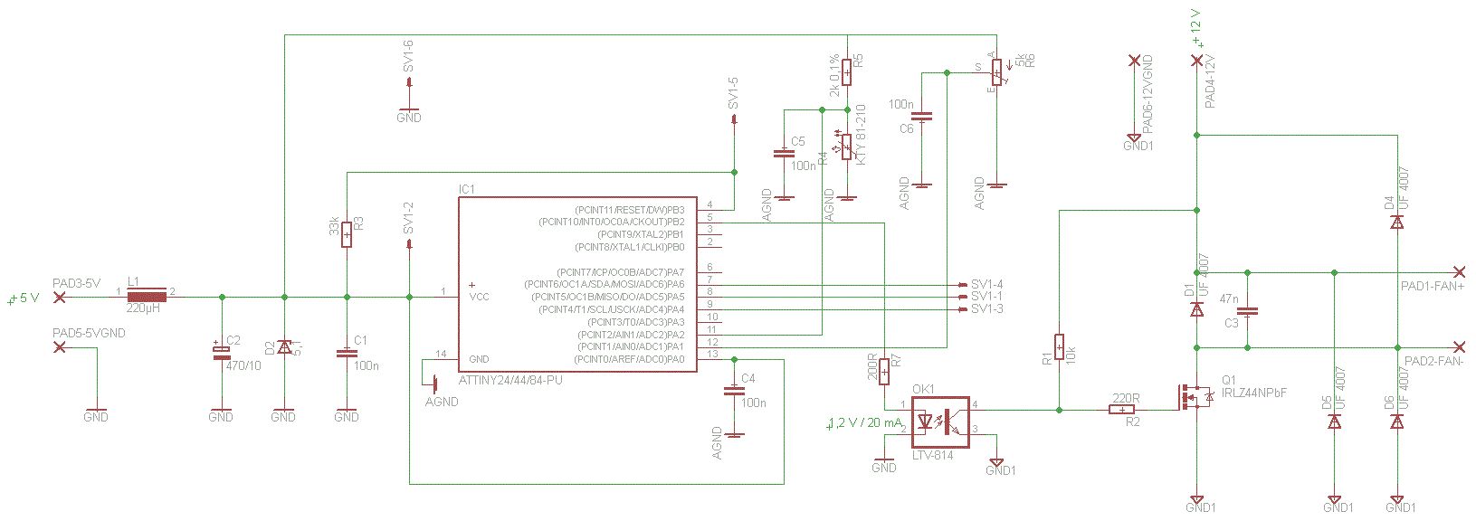 Zu deinen aktuellen EMV Problemen möchte ich nichts beitragen, aber vielleicht darf ich ja eine Anregung für ein Redesign machen. 1. Verwendung eines 4-pin Lüfters, diese sind wesentlich gedeihlicher anzusteuern als die klassische PWM Grütze http://www.formfactors.org/developer%5Cspecs%5CREV1_2_Public.pdf 2. Verwendung eines besseren Temperatursensors, entweder analog der LM75 oder digital so etwas wie der DS18B20 EMV-Probleme wirst Du mit diesem Ansatz kaum haben, darüber hinaus wird die Gesamtschaltung etwas kleiner.