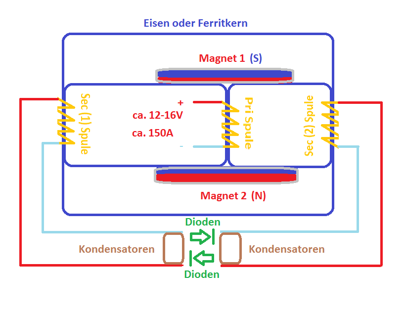 Hallo Leute! Hoffe es kann mir wer helfen. Ich bin über das Internet auf folgenden Aufbau gestoßen und habe diesen als Bilddatei mal nachgezeichnet. Es handelt sich um ein Netzteil das über 2 Sec. Spulen Kondensatoren Dioden / Magneten sich ständig neu indiziert. Über eine Prim Spule kann man dann den Nutz-strom abzapfen. Das ganze in einem Verhältnis von 1:3,7. Dachte Anfangs das ist nur ein Trick dahinter, aber nach genauerer Überlegung denke ich das es nicht mal so unwahrscheinlich/unvorstellbar ist das dieses System funktioniert. Bitte in diesem Beitrag mal nicht gleich voreilige und unsachgemäße Äußerungen zu machen. ---------------------------- Wer damit was anfangen kann bitte ich um Hilfe bei folgender Berechnung: Habe leider nur erstmal Angaben über die Leistung die ich benötigen würde. Frage 1 vor allen anderen: Habe im Internet gesehen das angeblich bei dem Aufbau ein Verhältnis von den Sec zur Prim Spulen von 1:3,7 möglich ist. Also um 370% mehr Leistung raus kommt. Ist das denkbar/möglich? Einbau in einem KFZ! Eingangsleistung also 12-16V gegeben durch Ladestrom der Lichtmaschine ca. 60A. Benötigter Nutz-strom ca. 12-16V und 150A Meine offen Fragen wären folgende: Wie Groß bzw aus welchem Material sollte der Kern bestehen? (mit oder ohne Luftspalt) Die Sec. Spulen Größe/Dimension schätze mal Kupferlackdrat / mm2? Wie viele Wicklungen werden benötigt? Welche Verluste gibt es durch thermisch/ohmsche Gesetze bzw wie kann man diese umgehen ausmerzen? Wie viel A werden benötigt? etc... Wie stark müssen die Super Kondensatoren und die Dioden sein? Ist mein vorgegebener Schaltplan so richtig oder gibt es Korrekturen Anpassungen? Wie stark müssen die 2 Nydemmagneten sein um das Ergebnis zu optimieren? Die Prim Spule: denke gleiche frage wie bei den Sec Spulen? Hoffe auf wertvolle Tipps und Berechnungen. Danke im Voraus für eure Mithilfe! Lg Martin
