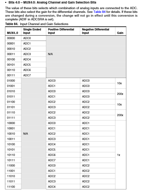 Bin ich gerade drübergestolpert - wie misst man eine Differenzspannung am selben Pin? Also z.B. ADMUX 01000: positiver und negativer Eingang je ADC0?