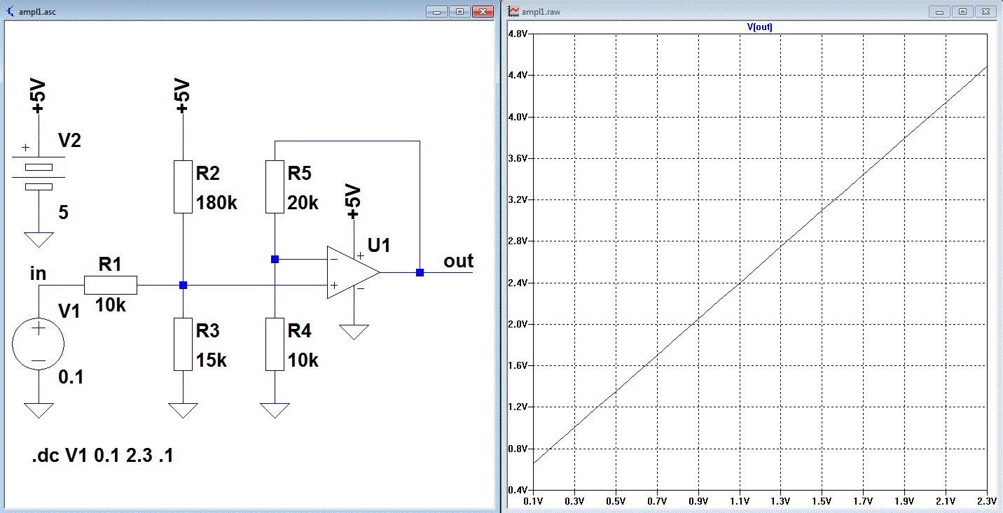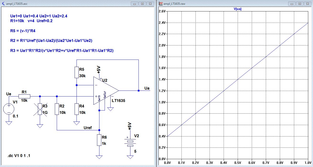 Hallo Steffen, das erstellen der Formel für R2 und R3 war doch aufwendiger als ich dachte, aber ich bin da hartnäckig. Ue1=0 Ua1=0.4 Ue2=1 Ua2=2.4 R1=10k v=4 Uref=0.2 R5 = (v-1)*R4 R2 = R1*Uref*(Ua1-Ua2)/(Ua2*Ue1-Ua1*Ue2) R3 = Ua1*R1*R2/(v*Ue1*R2+v*Uref*R1-Ua1*R1-Ua1*R2) Mir scheint die Referenzquelle kann nur Strom "sourcen". Ob das auch in der Realität so ist weiß ich nicht. Deshalb habe ich den 1kOhm Widerstand nach Masse eingebaut. Wenn man die Verstärkung v und die Referenzspannung Uref geschickt wählt, dann wird R3 unendlich, also nicht benötigt. Siehe in meinem Beispiel. Gruß Helmut