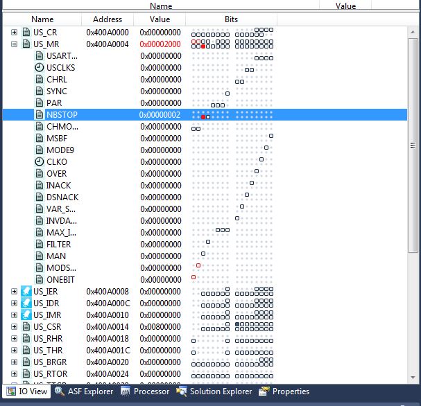 Bekomme den USART nicht zum laufen bei einem SAM4E EK. Mein Portpin auf dem EK (PA22 -> TXD) zeigt auf dem Scope keine Reaktion. Wenn ich bei usart_write() ein Breakpoint setze und mir nach der Initialisierung (usart_init_rs232()und usart_enable_tx()) die Register anschaue ist das US_CR Register von USART1 0x0. US_MR hingegeben passt 100% zu der gewählten Configuration und im US_CSR wechselt auch der Status von z.B. TXRDY. Das Problem liegt wohl im US_CR, da hier der Wert 0x00 ist und somit eigentlich auch die Bits RXEN und TXEN auf 0 sind?! Weiß jemand Rat? Gibt es noch irgendeinen Schreibschutz oder andere Feinheiten?