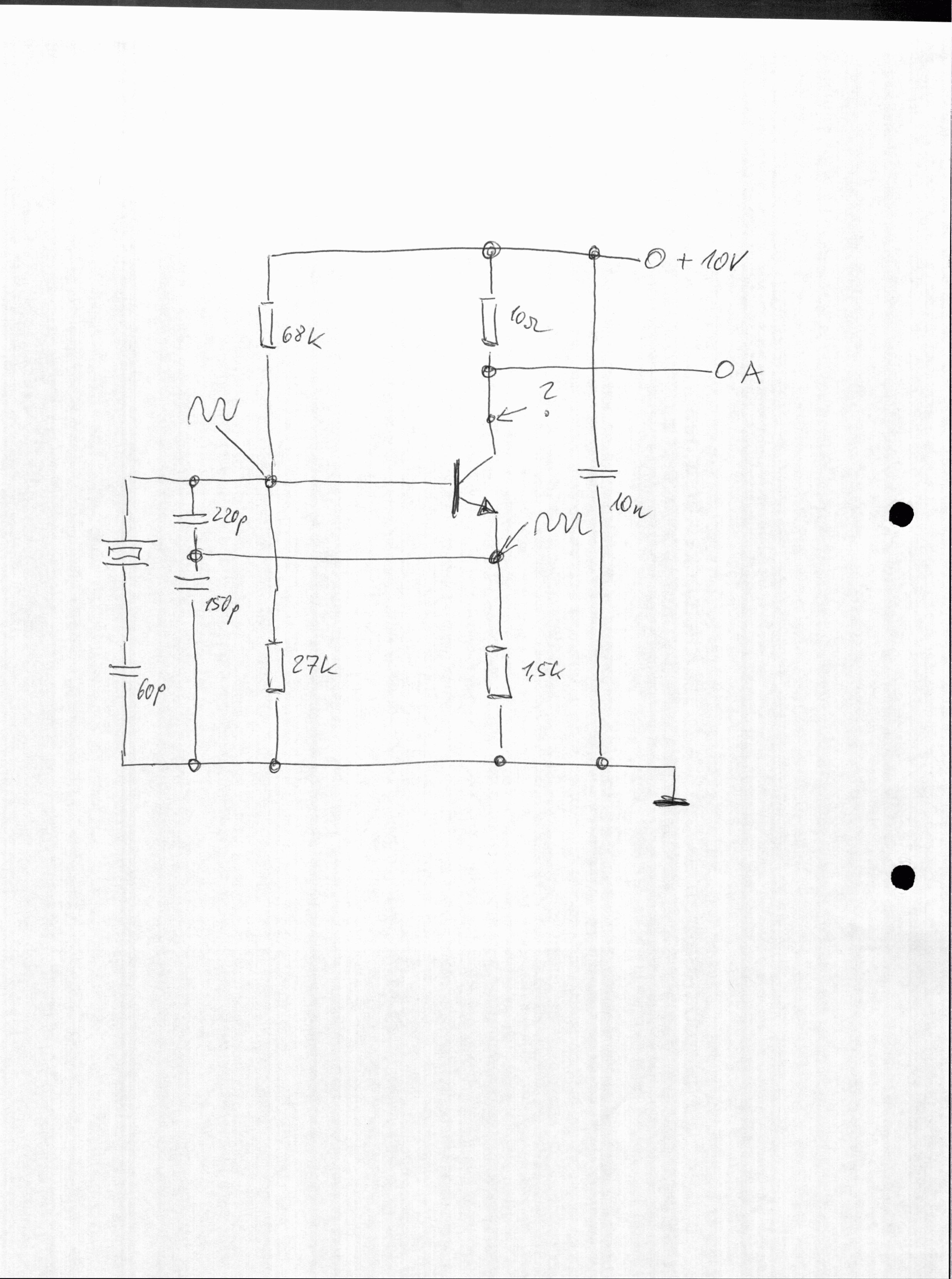 ... ich habe einen anderen Quarz =8MHz (Statt 15MHz) eingebaut und R5 durch 1,0k ersetzt. Am Ausgang kommt jetzt ein etwas verbogener Sinus mit 45,5mVeff raus. Laut Beschreibung sollen 30-50mVeff rauskommen. An der Basis= 3,51Veff (schöner Sinus mit 8MHz) Am Emitter= 2,45Veff (schöner Sinus mit 8MHz) DANKE!