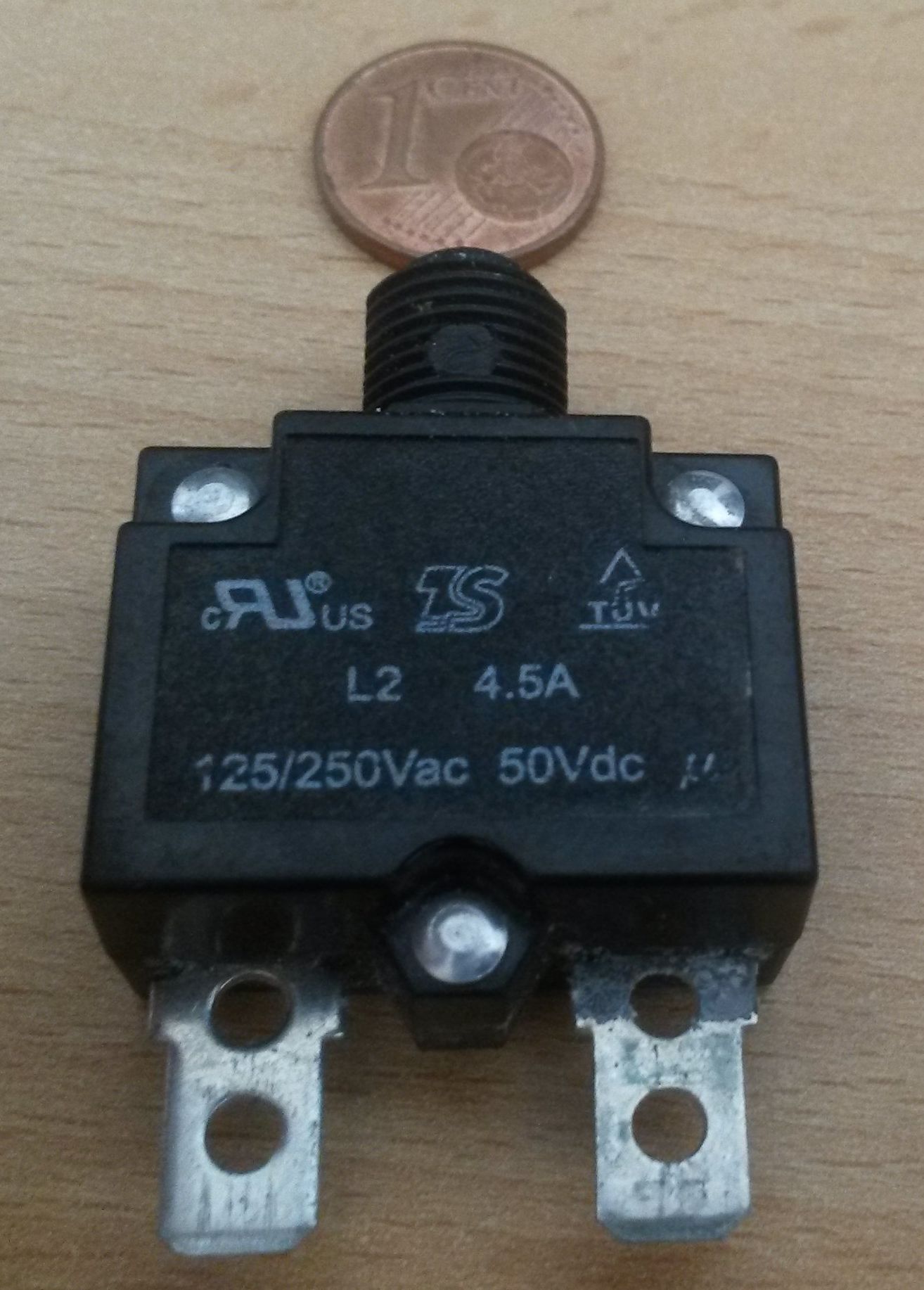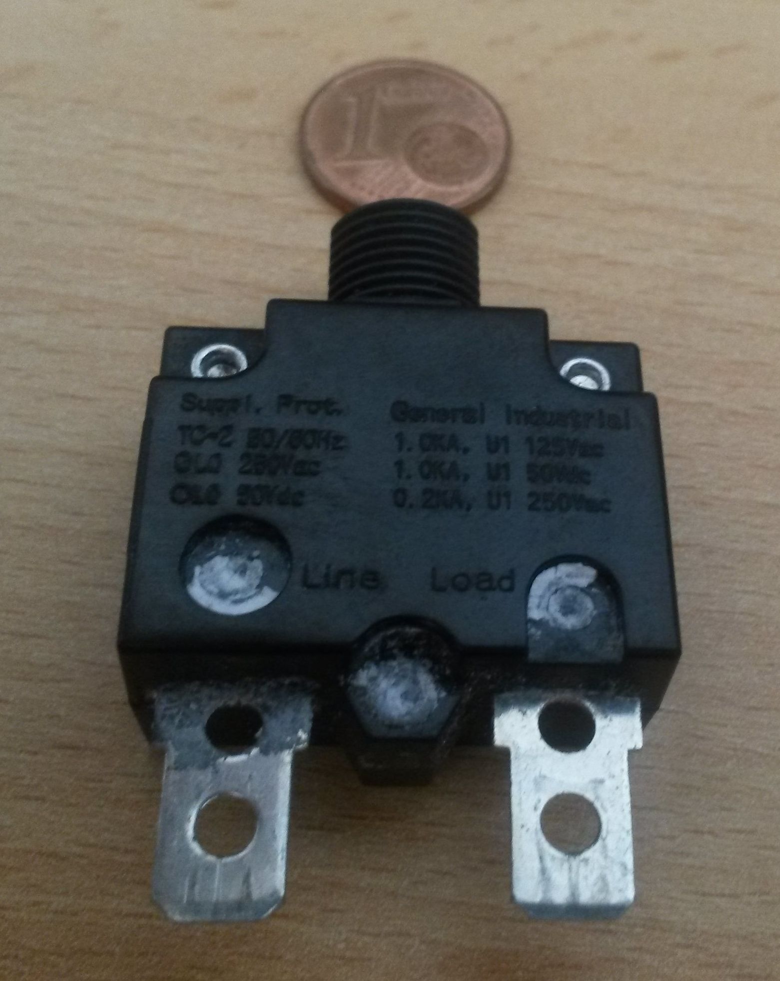 Das wird wohl eine rückstellbare Sicherung sein. Vielleicht auch als thermischer Überstromschutz bezeichnet. Diese Variante für Flachstecker / Frontplattenmontage gab es irgendwo zu kaufen, Reichelt oder Conrad möglicherweise. Ich finde bloß gerade nicht den richtigen Suchbegriff.