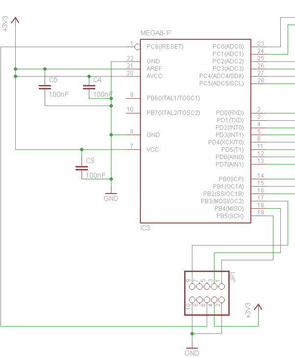 Hallo liebe Leute, ich möchte einen ATMega8 mit dem mkII flashen, der jedoch nur einen JTAG-Stecker hat. Ich möchte daher auf meiner Platine die Leitungen so verbinden, dass ich damit ohne einen Adapter direkt mit ISP programmieren kann. Die Pin-Beschaltung dafür habe ich aus folgender pdf-Datei: www.atmel.com/Images/doc2562.pdf (Seite 2). mkII - ATMega8 1 TCK SCK PB5 2 GND GND 3 TDO MISO PB4 4 VTref VCC 6 nSRST RESET PC6 9 TDI MOSI PB3 Kann ich das wie in meiner angehängten Datei machen? Gruß