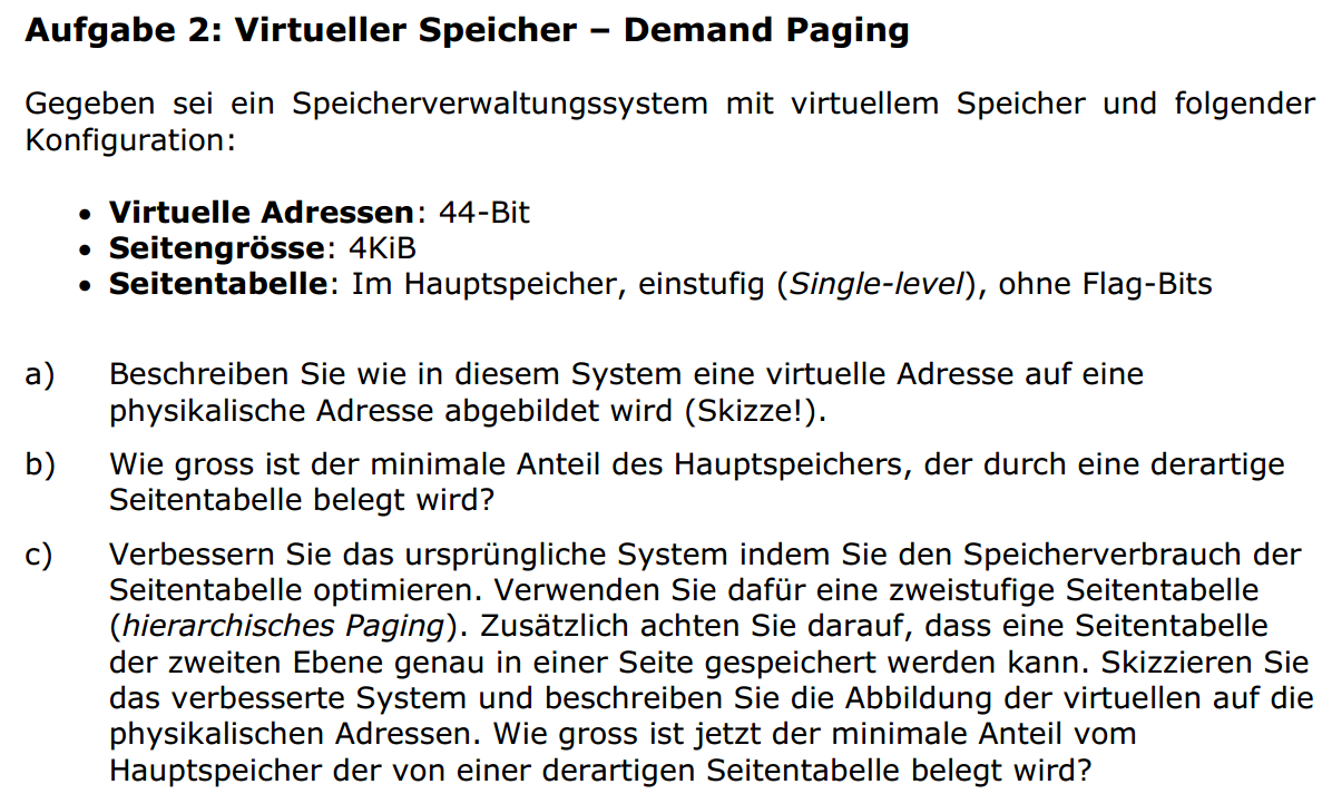 Hallo, gegeben ist die Aufgabe auf dem obigen Bild. Nun habe ich folgendes Problem: Wie kann ich erkennen wie gross der Seitenoffset ist? Da kann man ja nur raten, denn ich weiss ja nicht ob es sich um eine Byteadressierung, 2 Byteadressierung etc. handelt? In der Lösung kommt man auf 12 Bit Seitenoffset (also Byteadressierung), dass kann man ja nicht einfach annehmen oder? Und wie kommt man auf die Grösse der Seitentabellen Einträge? Die sind in der Lösung 32 bit? Gruss Bert