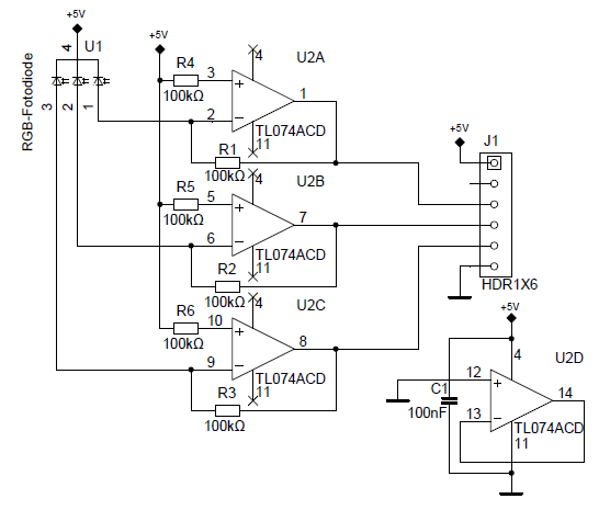http://www.conrad.de/ce/de/product/180381/ + 3 OPVs könnte funktionieren. Als OPV konnte man den MCP6L94 verwenden. Der im Schaltplan verwendete geht nicht, weil er nich R2R ist. Edit: J1 wird an +5V, GND und 3 ADC-Eingänge angeschlossen.