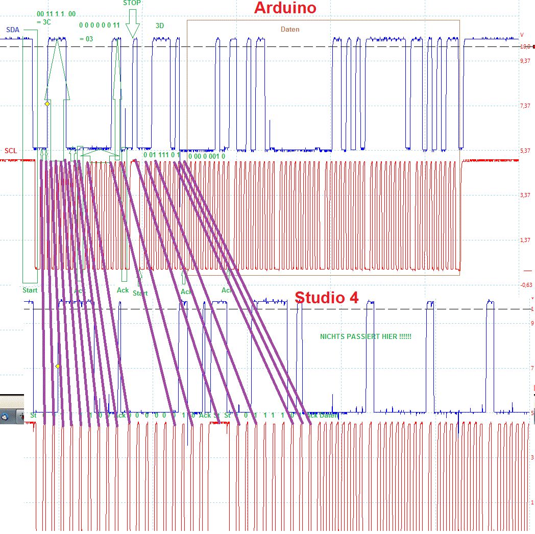 Slave reagiert sauber, Ackn usw. aber nach dem Schreiben von 0x3D gibt er keine Werte aus. Habe dann mal Arduino Sketch aufgebaut, der funktioniert. habe dann selbe Anschlüsse genommen und wieder keine Werte - hat jemand ähnliche Erfahrungen gemacht - bin hier langsam am Verzweifeln. Oszibilder sehen gleich aus, aber eben keine Werte auslesbar, nur 0en.