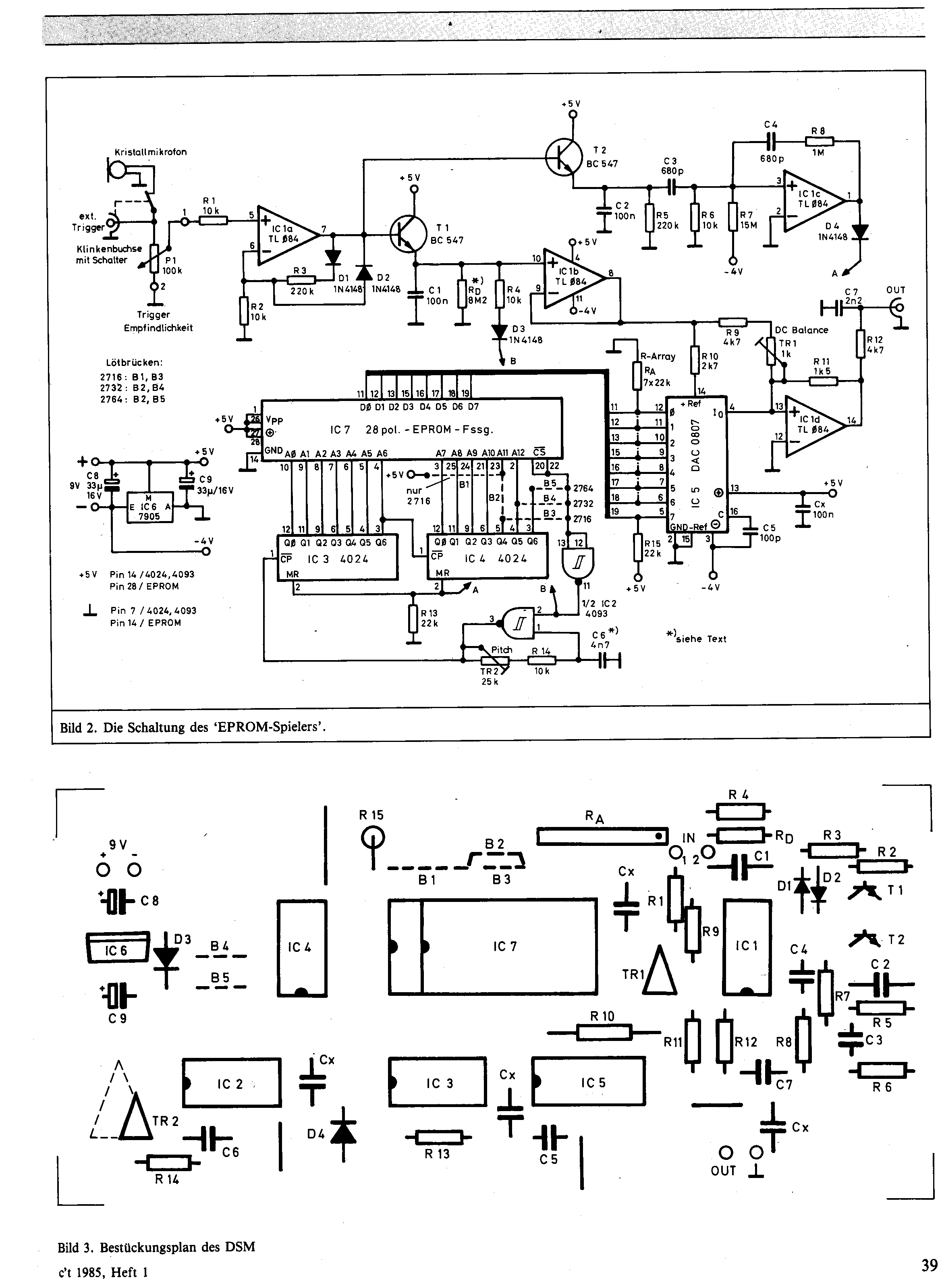 Lang lang ist´s her... Ich hab doch eine Weile suchen müssen, Januar 1985 war das in der c't. Ich meine, man kann auch diese alten Hefte digitalisiert auf CD oder DVD kaufen, daher hier nur das Schaltbild zur Ansicht. Ein gewöhnliches Kristallmikrofon (ein Kristall-Ohrhörer tuts vermutlich auch) wird verstärkt, je nach Anschlagstärke wird C1 unterschiedlich geladen. Diese Spannung beeinflusst die Ausgangsspannung des DA-Wandlers DAC0807 über seinen Referenzeingang oben. Die Epromadressen werden vom Taktgenerator aus zwei Schmitt-Triggern CD4093 mit zwei Binärzählern CD4024 hochgezählt. Am Ende hält das ganze durch ein entsprechend gesetztes Bit im Eprom an, gleichzeitig wird damit C1 über D3 völlig entladen. Beim nächsten Anschlag wird wieder über die Schaltung ganz oben via Zähler-Reset das Eprom von vorn gestartet.