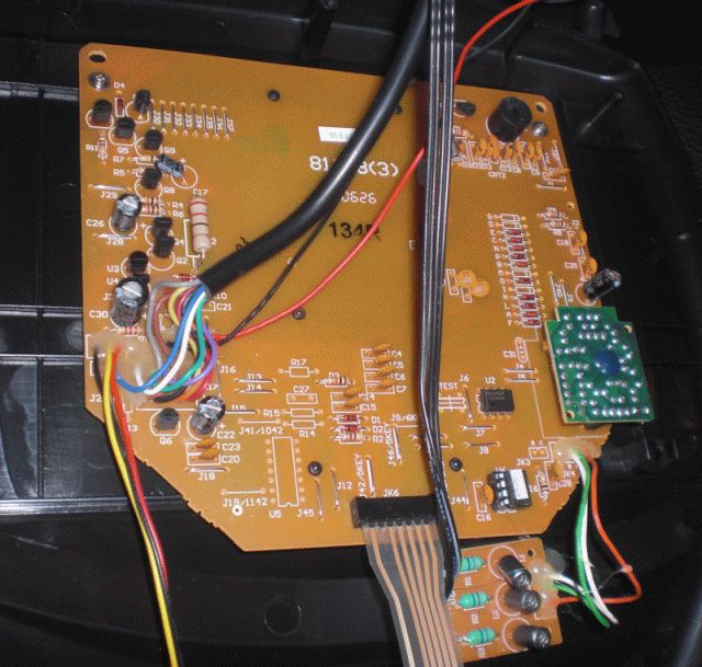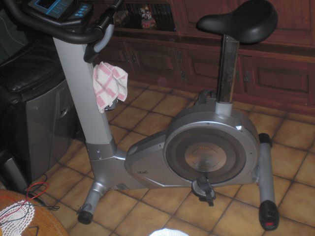 ich habe hier ein ältliches Ergometer, bei dem die "Bremse" der Pedal-Schwungscheibe nicht funktioniert. Die Hauptplatine ist schnell erklärt: 1. an JK06 (Flachbandkabel) kommen die Tasten des Bedienfeldes (Folientastatur) rein. 2. Die kleine Zusatzplatine rechts neben dem Flachbandkabel dient zum .?. des Griffsensoren am Lenker(das sind die 4 Adern dei senkrecht duchs Bild gehen. 3. rot/schwarz geht zum Batteriefach (So man das Teil mit Batterien betreiben möchte) 4. Das 10-adrive farbge Kabel geht zur Bremse, und zur KLeinspannungs-Hohlbuchse am unteren Rahmen [keine Ahnung wie das verschaltet sein könnte] 5. schwarz-rot-gelb geht zu einem rosa angemalten "Bonbon", der irgendwo im Kopfteil des Ergometers mit Klebeband befestigt ist. 6. bei der rechten grünen Huckepack-Platine vermute ich irgendwas zum Ansteuern des Displays. Den nicht funktionierenden Motor schieb ich auf einen Wackler in der Hohlbuchse, oder auf einen defekten Transistor im linken Bereich. Ich hab die Hauptplatine aber noch nicht weiter auseinander genommen. Frage: Was könnte denn blos dieser rosa Bonbon sein? Ist das ein diskreter Schaltwandler? Die Bezeichnung des Strampelrades lautet EB-4, aber da find ich im Internet nix gescheites zu, und eine Bedienungsanleitung dazu gibt es auch nicht (mehr). PS: NEIN, das ist nicht mein Wohnzimmer ;-)