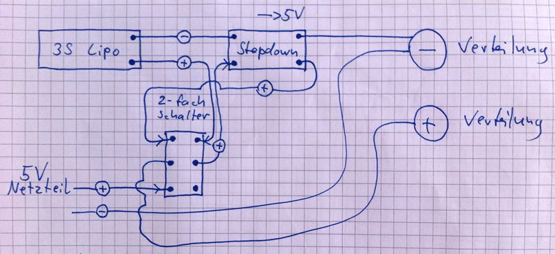 Hallo, ich bin dabei ein Gerät mit 5V-Verbrauchern zu bauen. Dieses Gerät soll wahlweise mit Netzteil oder Lipo betrieben werden können. Diese Auswahl geschieht über einen Schalter, welcher zwei unabhängige Kreise schalten kann (siehe Bild). Da sich im Netzbetrieb der Lipo nicht entleeren soll, soll über den zweiten Kreis des Schalters die Verbindung zum Stepdown-Wandler unterbrochen werden. Ich frage mich nun, ob ich die Schaltung einfach so aufbauen kann, oder ob ich an div. Stellen Dioden setzen soll. Gruß Chris