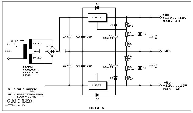 Hallo, meine Frage an Euch: Ich brauche ein Dualnetzteil, einstellbar von ca. 10 bis 18 Volt, 1 Ampere genügt. Es soll mit dem LM317 und dem LM337 aufgebaut werden. Ich finde zwei verschiedene Vorschläge für den Teil vor den ICs. Wie in den Bildern zu sehen, gibt es solche, die die Masse von der Mittelanzapfung der Sekundärwicklung bis zum DC-Ausgang durchziehen. Und eben solche, die zwei Gleichrichterbrücken verwenden, eine für den positiven Zweig und eine für den negativen Zweig. Dabei wird die Masse dann erst nach den Brücken gebildet. Gibt es Vorzüge einer der beiden Versionen? Was für Auswirkungen hat der Unterschied? Ich will Operationsverstärker damit betreiben, ist eine der beiden Schaltungen vorzuziehen?