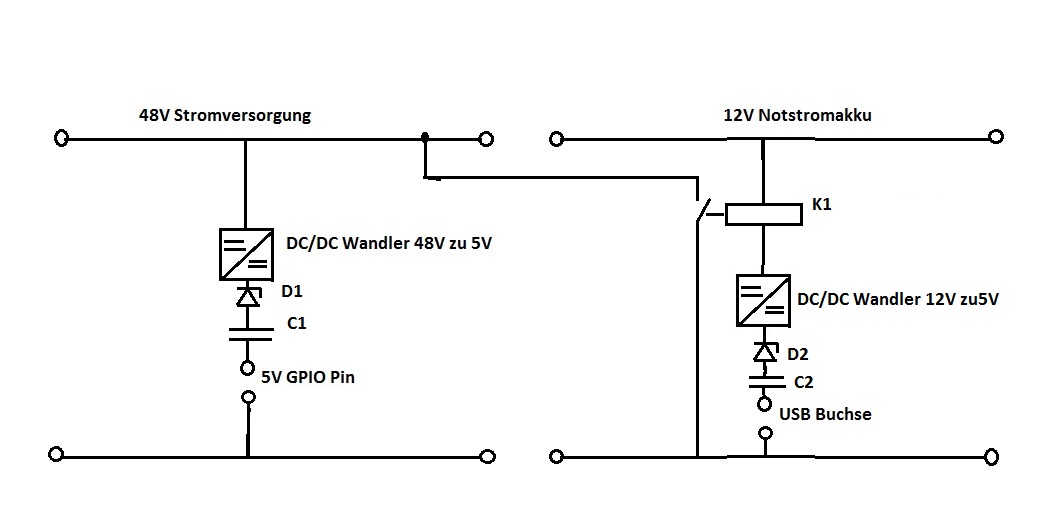 Was ist den da jetzt Falsch ? Ich glaub ihr meint die Darstellung des Schaltplans, das der Schalter von K1 einen Kurzschluss gegen Masse verursacht. Die Schaltung jetzt so umzubauen, das der Raspberry über den Akku versorgt wird und der Akku ständig von den 48V geladen wird ist zu spät. Der Raspberry ist schon so konfiguriert, das er über die 48V läuft, die 12V Notstromversorgung soll jetzt noch zusätzlich verbaut werden.