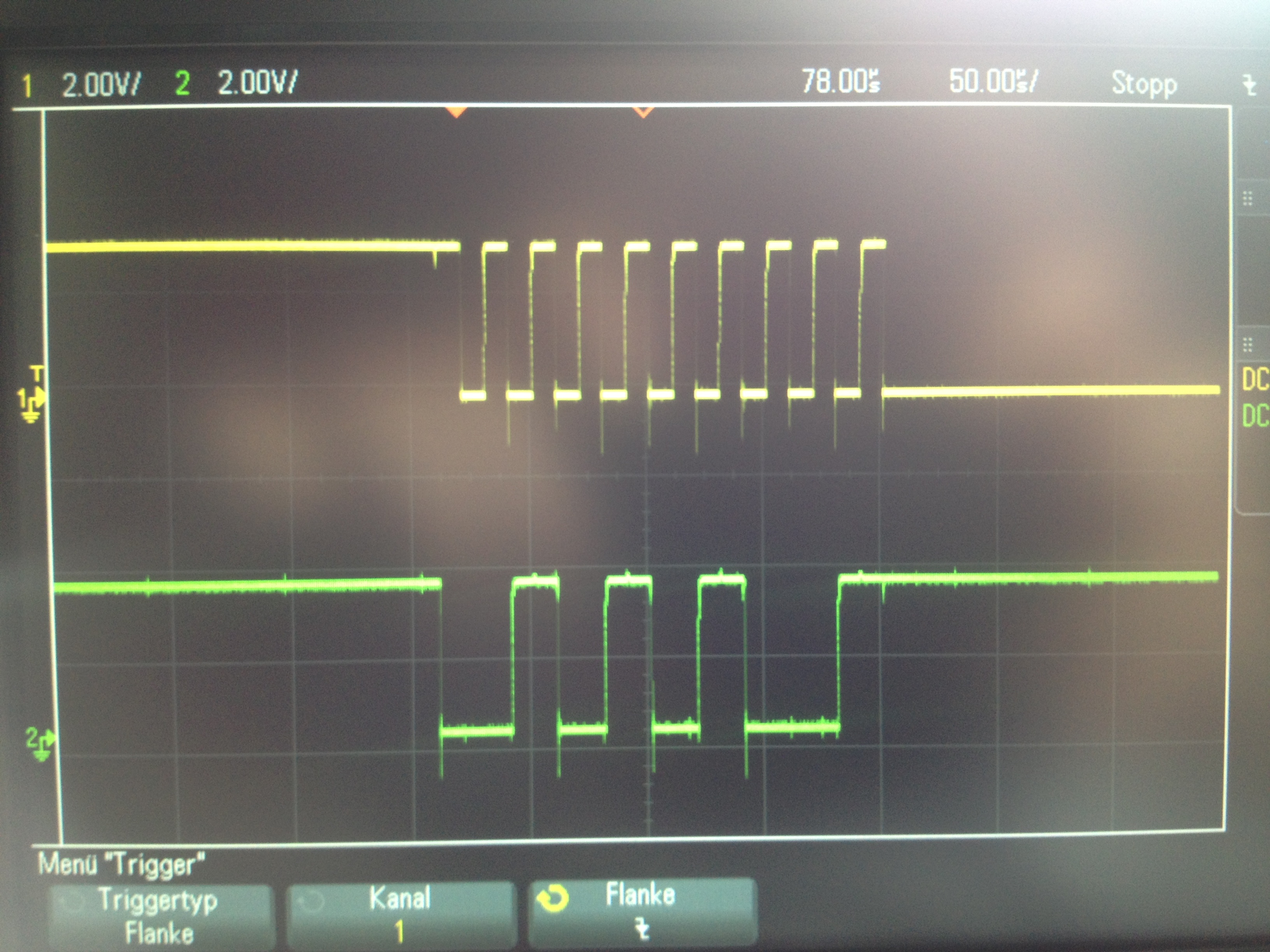 Hallo an alle, Ich probiere einen ST1332 Touch Controller über I2C anzusprechen. Leider bringt der ST1332 unter seiner Adresse 0x55 kein ACK-Bit. Dies habe ich gemessen um den Fehler zu finden, leider ohne Erfolg bisher: Ich habe DIREKT am Chip SCL und SDA gemessen (siehe beigefügtes Bild): - Es kommt eine korrekte I2C-Startbedingung - anschließend 7 Adressbits = 0x55 - dann das WriteBit = 0 - beim 9. Clock kommt vom Controller kein ACK-Signal - Am ST1332 sind 3,3Volt und GND vorhanden. - Die Reset-Leitung ist auf High. (Reset Pulse davor kam) - Die Frequenz ist mit 50kHz niedrig. - Ich habe probehalber von der Software alle 127 I2C Adressen durchspielen lassen --> niemals eine Antwort vom Controller - Die Leitungen werden vom Prozessor mit Open-Collector getrieben, ich kann von Hand per PullDown die Leitungen auf Low ziehen, der Controller hätte also auch diese Möglichkeit.... Hat jemand Erfahrung mit dem ST1332 von Sitronix? Der ST1332 hat auch ein SPI Interface, dessen Leitungen sind mit I2C teilweise gemischt. Vielleicht ist der ST1332 per Default im SPI-Mode? Wie schaltet man um auf I2C? Habe im Datenblatt dazu nichts gefunden... Vielen Dank für Eure Hilfe Andreas