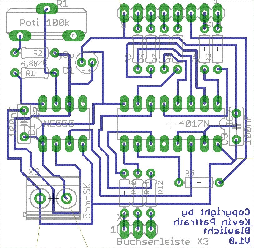 So ich noch mal. Irgendwie verzweifel ich langsam. Meine erste Platine hatte ich falsch geätzt also Spiegelverkehrt. Problem hier mein NE555 wurde nach Stromanschluss heiß. Ich konnte also nur vermuten das irgend etwas durch das falsch rum passiert ist. Also noch mal von vorne begonnen. Neue Platine erstellt mit anderer Leiterbahn. Platine geätzt und alles verlötet. Nun das gleiche Problem. Der NE555 wird heiß. Ich finde einfach den Fehler nicht. Das auf Lochraster gelötete Modell hingegen funktioniert komischer weise einwandfrei. Hoffe nun das ihr vielleicht wisst wo es dran liegen kann das der NE555 heiß wird und nichts passiert. Schaltplan und Board als gif dabei. Gruß Kevin