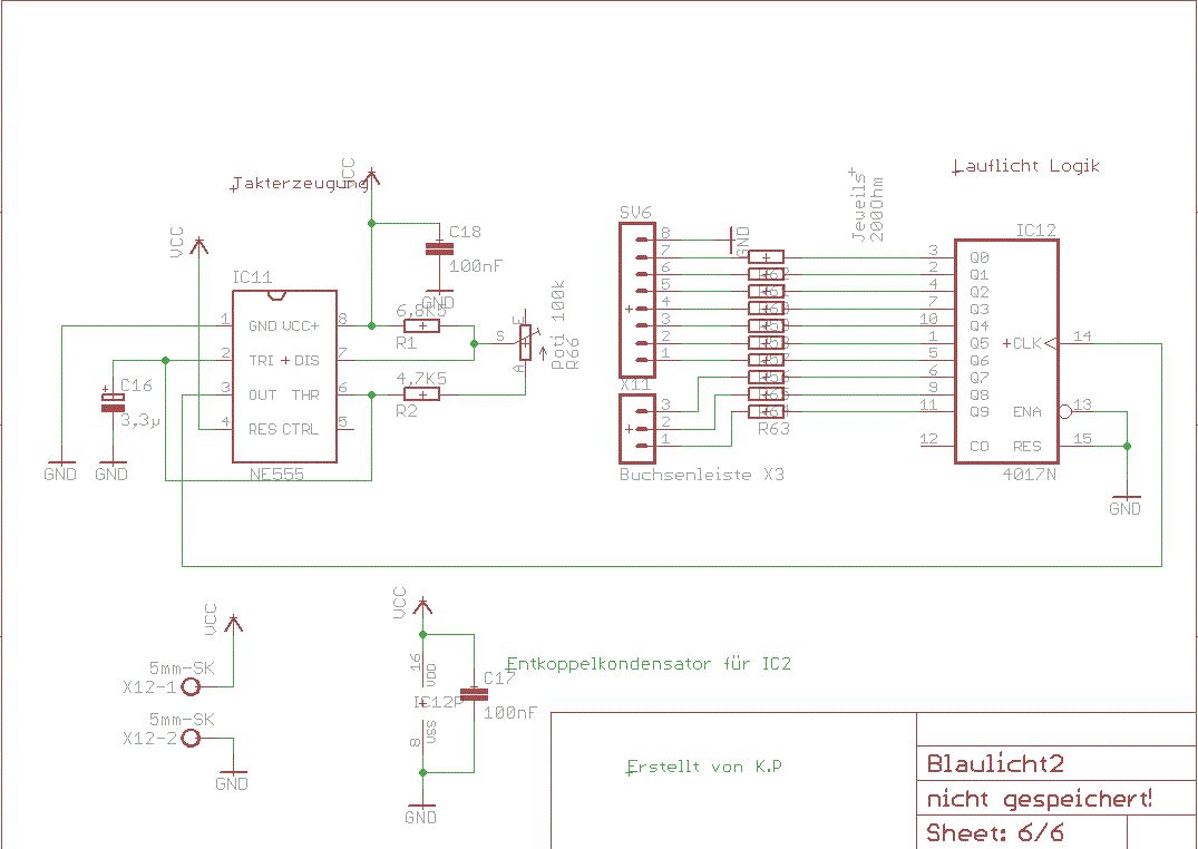 Da keine Bearbeitng mehr möglich ist noch eine kleine Korrektur. Es waren deffenetiv plus und minus vertauscht. Der NE555 wurde also nicht mehr heiß. Jedoch leuchtete eine LED und das Lauflicht lief nicht. Nach einer Zeit merkte ich das diesmal der 4017 heiß wird. Ich kann mir dies allerdings nicht erklären da alles zu stimmen scheint. Gruß Kevin