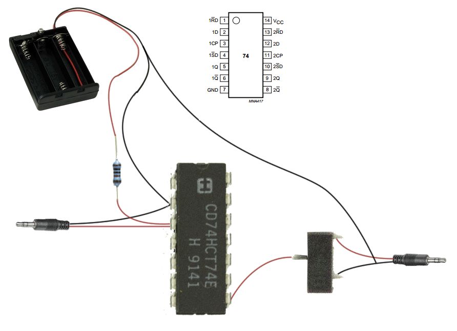 Hallo, glücklicherweise haben ich ein Geschäft in der Nähe wo ich die Teile besorgen konnte. Lediglich den Transistor gab es nicht, woraufhin ich einen anderen, wohl vergleichbaren aber leider winzig kleinen bekommen habe (Ich hatte das Datenblatt vom BSH103 ausgedruckt und denen hingehalten). Das Flipflop hat ja eine Arbeitsspannung von 2-6V daher haben sie mir einen Batteriehalter für 3 AA Batterien gegeben. Mein Problem ist jetzt dass ich den obigen Schaltplan leider nicht ganz durchschaue. Ich habe mal eine Skizze angehängt wie ich ihn interpretieren würde, allerdings bin ich mir sicher dass da was nicht stimmt. Da der Transistor für meine Verhältnisse eher mikroskopisch ist, bin ich versucht noch mal in das Geschäft zu gehen um einen größeren zu besorgen. Hat da jemand eine Empfehlung für mich (Die Spannung ist ja jetzt auch anders als bei Knopfzellen, oder)? Das Sortiment des Shops kann man unter http://www.ebg-darmstadt.de/ durchschauen. Ich habe mich auch mal über meine Kamera informiert und zu dem Fernbedienungsanschluss Folgendes gefunden: "(...)bezieht seine Betriebsspannung aus den beiden Signalleitungen, die aus der Kamera kommen. Diese beiden Leitungen (Focus und Shutter) sind Kameraintern über etwa 50kΩ mit der Betriebsspannung (etwa 3.0V bei Canon) verbunden." Ich habe jetzt nur etwas Angst dass die 4,5V die Elektronik der Kamera beschädigen könnten, aber der Transistor sollte das ja verhindern?