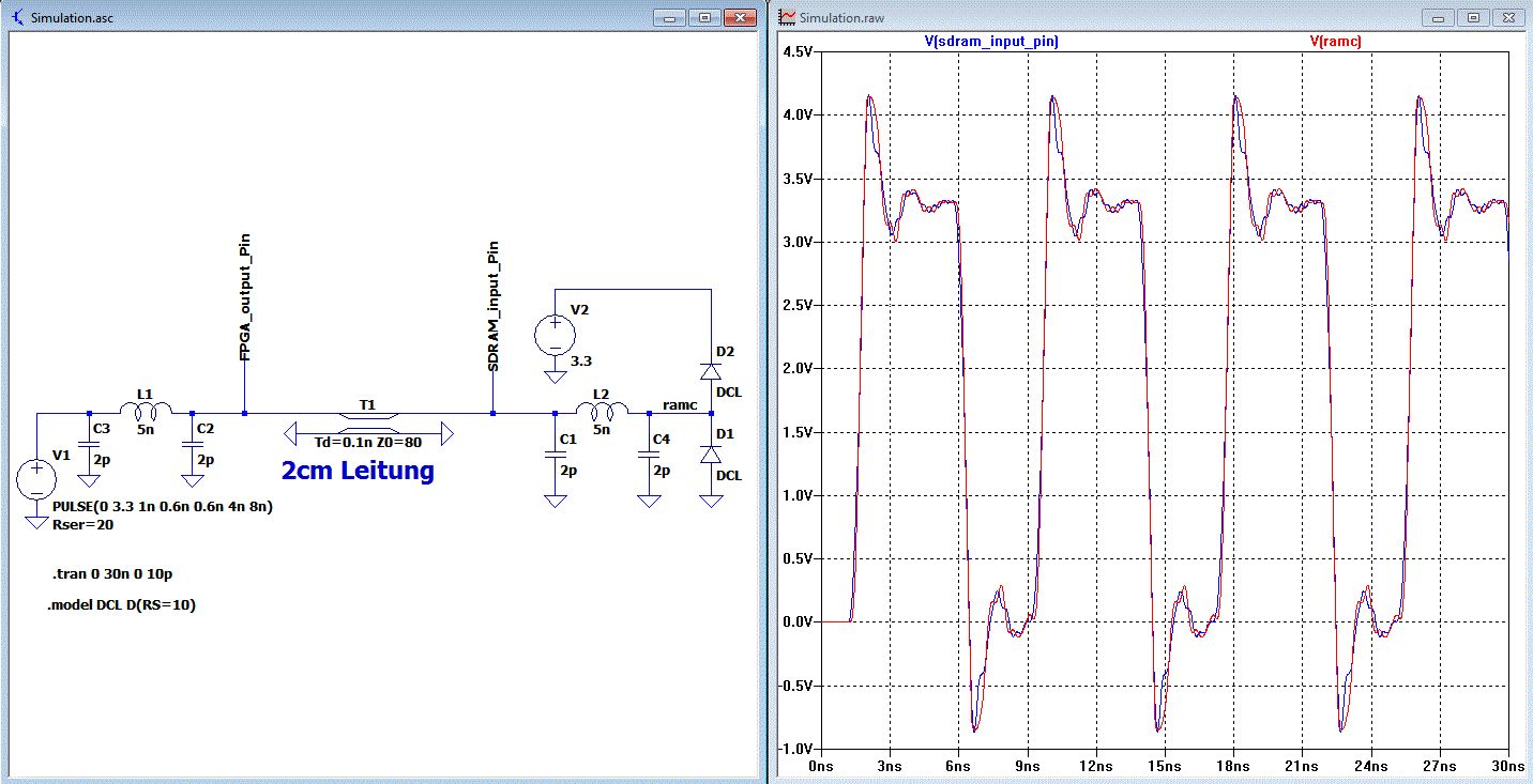 Hallo Leute, nun ist es soweit: ich möchte mich an FPGA Designs versuchen. Zurzeit bin ich dabei einen MT48LC32M8A2P-7E SD-RAM Baustein an einen XC3S50AN-4TQG144C anzuschließen. Das beim Layouten des 4-Lagigen Boards habe ich alle Steuerleitungen (breite: 0,2 mm) auf die Länge von 10,4 mm getrimmt. Trotzdem mache ich mir sorgen um Signal Integrität, da ich wenig Ahnung davon habe. Die Angaben aus dem Speicher-Datenblatt besagen, dass eine Input-Leitung eine Worst-Case Kapazität von 6 pF hat, der Leitungswiderstand FPGA-SDRAM ca. 26 milliohm beträgt. Die Leitungsinduktivität (nach Wikipedia) L=1,2 nH/mm * 10,4 mm = 12,48 nH. Die Signalanstiegszeit vom FPGA habe ich willkürlich als 0.6 ns angenommen. nun zeigt meine LT-Spice Simulation, dass die Signalqualität ziemlich mies sein wird. meine Frage: 1) wo finde ich die Angaben zur Signal-Anstiegszeit des XC3S50AN-4TQG144C 2) ist die Abbildung der SRAM-Eingänge als reine Kapazität richtig? 3) ist die Abbildung der Leiterbahnen als RL Reihenschaltung richtig? 4) ist mein Simulationsansatz überhaupt richtig, oder ist hier schon eine Art FEM Simulation nötig?