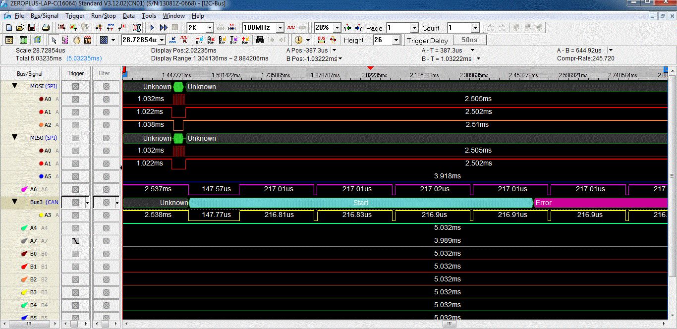 Hallo! Zur Umsetzung eines Bussystems würde ich gerne den CAN-Bus und dazu den Controller MCP2515 in Verbindung mit einem MCP2551 verwenden. Die SPI Verbindung zu MCP2515 erfolgt ordnungsgemäß: es können sowohl Register beschrieben als auch gelesen werden. Nachdem die Register geladen und der Sendebefehl erteilt wurde, sind mehrere Pegelwechsel auf dem Bus erkennbar, die jedoch vom CAN-Bus Standard weit entfernt sind. Das angehängte Bild zeigt die Aufnahme meines Logicanalyzers bei einer Abtastfrequenz von 1MHz. Der Eingang A6 zeigt den Pegel des Pins "TXCAN" vom MCP2515. Um das Rad nicht neu erfinden zu müssen, verwende ich die Programmbibliothek und die Hardwarebeschaltung von kreatives-chaos.com. Software : http://www.kreatives-chaos.com/artikel/ansteuerung-eines-mcp2515 Hardware: http://www.kreatives-chaos.com/artikel/can-testboard Nach einigen Forenbeiträge soll die Software und die Beschaltung auch gut funktionieren. Der einzige Unterschied zur Beschaltung: Ich verwende für den uC und den MCP2515 einen Quarz mit 3,6864 MHz. Hatte jemand von Euch auch schon dieses Problem bzw. was könnte Eurer Meinung nach der Fehler sein?