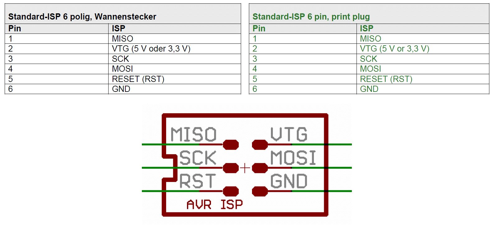 Mein Posting war Blödsinn. Ich habe es einmal durchgemessen (Danke cyblord - während Du geschrieben hast habe ich die offensichtliche Idee auch gehabt...). Hier wie es aussieht - falls das Problem bei sonst jemandem auftaucht: Das erste Bild ist die Buchse, wenn man draufschaut. Das rote Kabel ist Pin 1, also MISO. Das zweite Bild zeigt das Kabel, das dann am Steckbrett angeschlossen wird. Der Stift steckt in Vcc. Der Pfeil der Pin 1 am Stecker anzeigt ist zu erkennen. Danke an alle!!! Chris