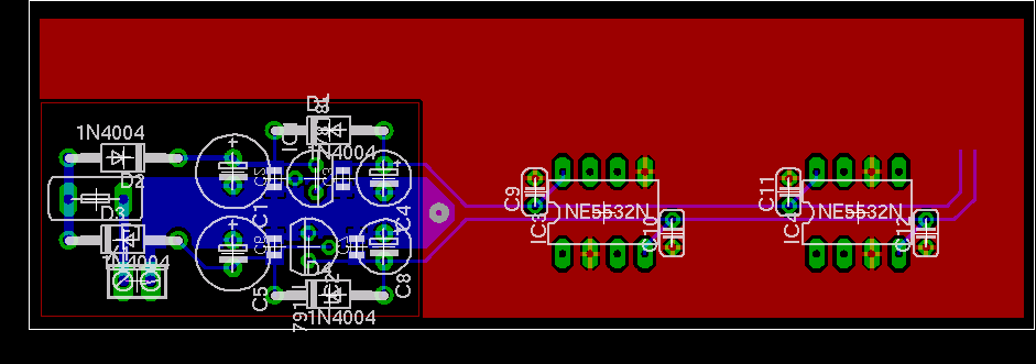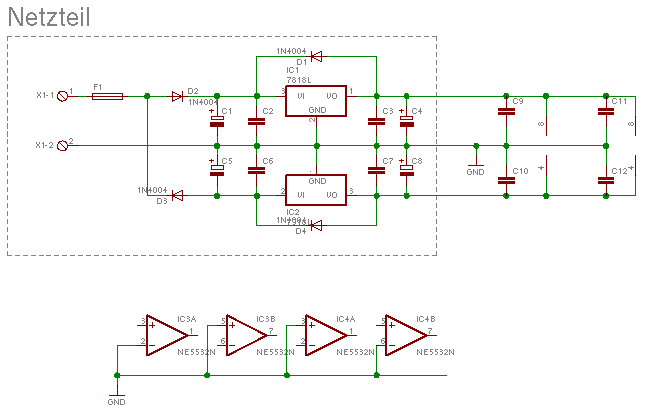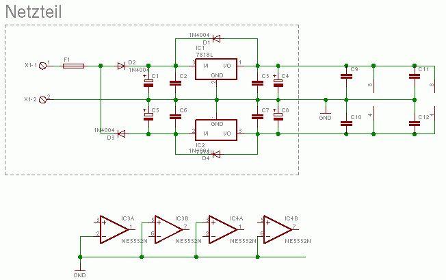Wo es gerade um Masseflächen geht: Gelegentlich liest man, dass die Massefläche ausnahmslos alle Masseverbindungen abdecken soll. Wie sieht es aus, wenn die Gleichrichtung der Versorgungsspannung auf der gleichen Platine stattfindet? Ist es dann evtl. sinnvoll, die Ladeströme zwischen Gleichrichter und erstem Elko von der Massefläche fernzuhalten und die Netzteilmasse erst hinter den Spannungsreglern mit der Massefläche zu verbinden? Es geht um einen Mikrofonvorverstärker, die Oberseite soll nur der Masse vorbehalten sein, Platine zweiseitig ohne Durchkontaktierung. Die Opamps etc. sind nur als Beispielverbraucher eingezeichnet, die Diode über dem 7918L ist so natürlich Murx. Grüße ;Matthias