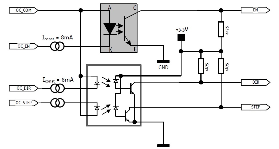Für mich liest sich das so, als müsse ich die EN/DIR/STEP Pins über einen Widerstand (um die 8mA einzustellen) auf Masse ziehen. Im Handbuch eines ähnlichen Controllers sieht das so aus (Zeichnung). Ich frage mich: gilt das auch für meine Beschaltung??