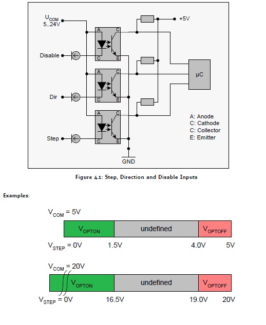 Hallo! Im Handbuch eines Trinamic Schrittmotors PD68 ist zu der Beschaltung des Step/Dir Eingangs die beigefügte Zeichnung zu finden. Frage: Was tut man auf die Eingänge?