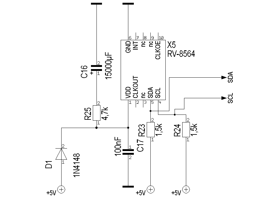 Habe das Problem noch mal etwas eingegrenzt: (Ich betreibe den RV 8564-C2 an einem Arduino Leonardo) Zustand: Supercap geladen, Arduino ohne Versorgungsspannung, pullups angeschlossen, SDA/SCL mit Arduino verbunden... Supercapspannung wird schnell entladen. Zustand: SDA/SCL von Arduino getrennt... Supercap hält Spannung. Anbei mal die Schaltung.
