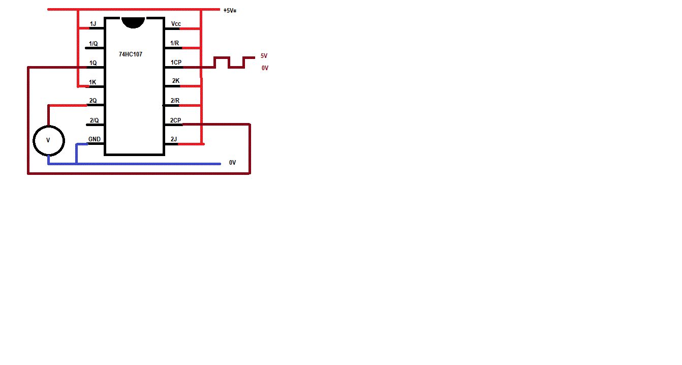 Hallo zusammen, hier jetzt mal der gezeichnete Plan. Mike schrieb: > vorausgesetz dein Eingangssignal erfüllte die > notwendigen H- und L-Pegel. > > Einen Kondensator über der Versorgungsspannung direkt am 74HC107 hast du > bestimmt eingebaut, auch wenn du das nicht erwähnt hast, oder? > > Benimmt sich die zweite Hälfte von deinem Baustein oder ein anderes > Exemplar genauso störrisch? Hallo Mike, um deine Fragen zu beantworten: 1. Ich bekomme ziemlich genaue 5V>0V Wechsel von der externen Steuerung geliefert. 2. Einen Kondensator habe ich nicht eingebaut. Zwischen Vcc und GND?? Welche Größe?? 3. Baustein habe ich schon Mal gewechselt mit dem selben Ergebnis. Da sich an 1Q schon nichts tut kommt auch kein Wechsel an 2Q zustande.