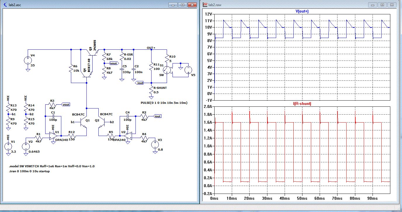 Dein Problem sind die verstärkenden Transistoren am Ausgang der Opamps. Nimm dort Basisschaltung. Außerdem solltest du so wenig wie möglich C am Ausgang des Netzteils haben aber trotzdem bei allen kapazitiven Lasten die extern kommen die Schaltung stabil sein. Alle Modelle sind in dem vorigen zip-file. Dort alle Files in das Verzeichnis von lab2.asc kopieren falls jemand simulieren will.