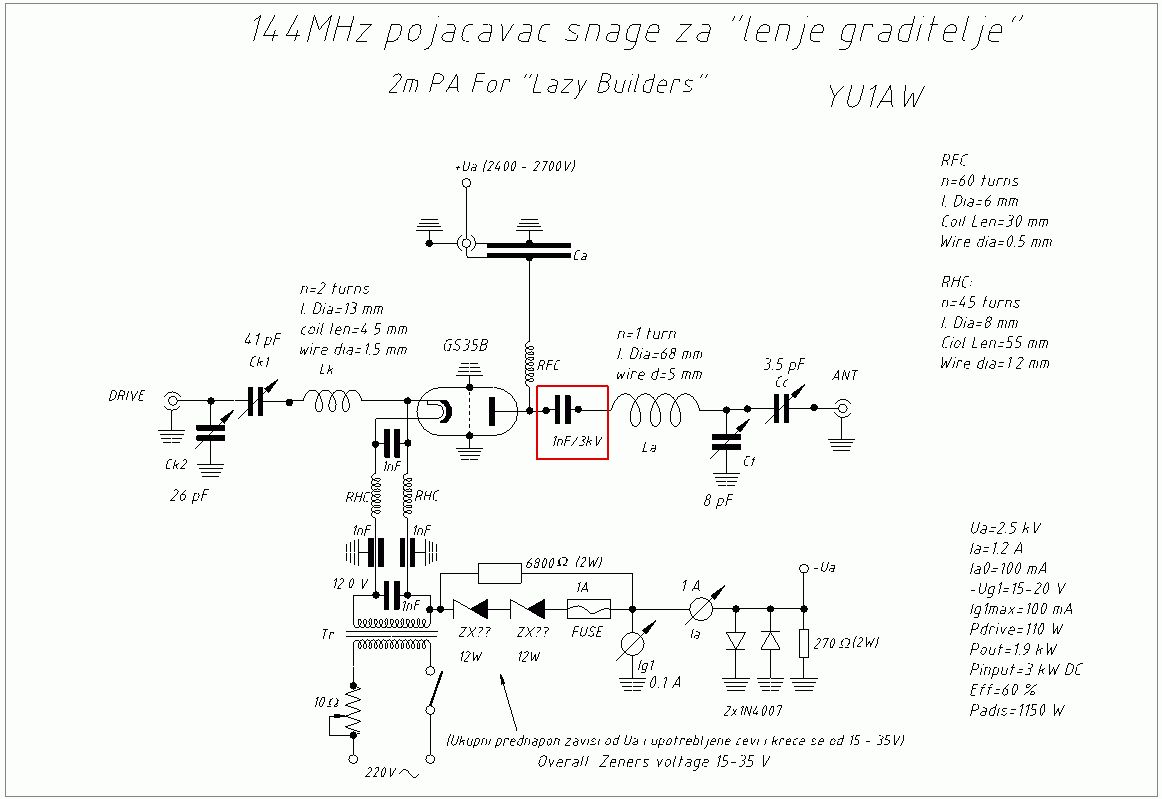 Hallo, wir haben ein kleines Effizienzproblem mit unserer GS35b-PA für 2m nach einem Röhren- und Kondensatortausch. Der Schaltplan entspricht der "1xGS35B 2m Lazy Builders PA" von YU1AW, der mechanische Aufbau richtet sich nach dem Dokument von OK1GTH (http://www.qsl.net/yu1aw/VHF_PA/gs35b%20ok1gth.PDF) Vorgeschichte: Die PA (PA_alt) wurde aufgebaut und funktionierte zufriedenstellend (Pout >750W) bis sich der 1nF-Kondensator im Ausgangskreis während dem Betrieb verabschiedete (innen durchgeschlagen/verkohlt). Wohl war dieser nicht für so hohe HF-Leistungen geeignet und wurde durch ein größeres Exemplar ersetzt. Da die Ausgangsleistung mit kaputtem Kondensator zurückging wurde die PA vom Operator stärker angesteuert, wodurch (vermutlich) auch die Röhre beschädigt wurde. Mit neuem Kondensator hat die alte Röhre bei kleiner Ausgangsleistung (<300 W) eine ungewöhnlich hohe Verstärkung gehabt (~16 dB), bei hoher Ausgangsleistung (>400 W) stieg der Anodenstrom nach ~30 Sekunden innerhalb ~2 Sekunden auf >1A an und die Ausgangsleistung ging auf wenige 10 W zurück. Nachstimmen währenddessen brachte keine höhere Ausgangsleistung. Mit neuer Röhre trat dieses Problem nicht mehr auf, jedoch ist der Wirkungsgrad bei weitem nicht mehr so gut wie ganz am Anfang (PA_aktuell). Nach http://www.dg2kbc.de/gs35.php sollte die GS35b bei 2m mindestens 14dB Verstärkung bringen. Auf diese Werte möchten wir in Etwa auch kommen. Unsere Anodenspannung liegt bei 3,2 kV bei einem Anodenstrom von 450 mA, Gitterstrom von 150 mA und einem Ruhestrom von 150 mA. Die Eingangsleistung beträgt ~50W, die Ausgangsleistung nur ~450W. Der Ein- und Ausgangskreis wurden jeweils auf Leistungsmaximum abgeglichen, der Anodenstromdip liegt knapp daneben. Welchen Zweck hat der rot markierte 1nF Kondensator? Da der 1nF-Kondensator bei 144MHz eine Impedanz von ~1 Ohm hat und zusammen mit der Induktivität La einen Serienschwingkreis für ~15MHz bildet, vermute ich dass der Kondensator nur als DC-Block dient, ein überbleibsel der Schaltung mit Pi-Ausgangskreis mit Induktivität nach Masse. Der Ausgangskreis zur Impedanztransformation besteht lediglich aus der Induktivität La und den beiden Kapazitäten C1 und Cc, oder? Wie wird ein solcher Ausgangskreise berechnet? Könnte bei unserem Aufbau mit 1mm PTFE-Folie zwischen den Platten der Kondensatoren C1 und Cc der 1nF-Kondensator entfallen? Durch den Einbau des (mechanisch) größeren Kondensators musste die Induktivität La etwa 5mm gestaucht werden, reicht dies aus um den Ausgangskreis so stark zu verstimmen? 73, Uran