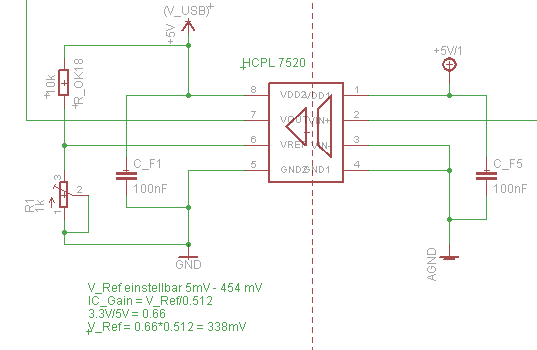 Hallo, hat schonmal jemand den HCPL 7520 verwendet? Ich habe ihn nach Datenblatt verschaltet und auf Vref 338mV gegeben. Nach Datenblatt berechnet sich die Verstärkung zu: G = Vref/0.512 = 0.338/0.512 = 0.66 Das Eingangssignal variiert zwischen 0V und 5V. Dieses Signal möchte ich optisch isoliert übertragen und gleichzeitig mit Hilfe der Verstärkung auf den Bereich meines AD-Wandlers (0V-3.3V) anpassen. Am Ausgang des Verstärkers kommt nun aber nur 0V an. Kann es sein, dass Verstärkungen kleiner 1 mit dem IC nicht möglich sind? Im Datenblatt konnte ich dazu nur finden, dass Vref min. 0V und max. Vss + 0.5V betragen darf. Empfohlen werden 4V als Vref. Viele Grüße Christian HCPL 7520 Datenblatt: http://www.farnell.com/datasheets/1266244.pdf