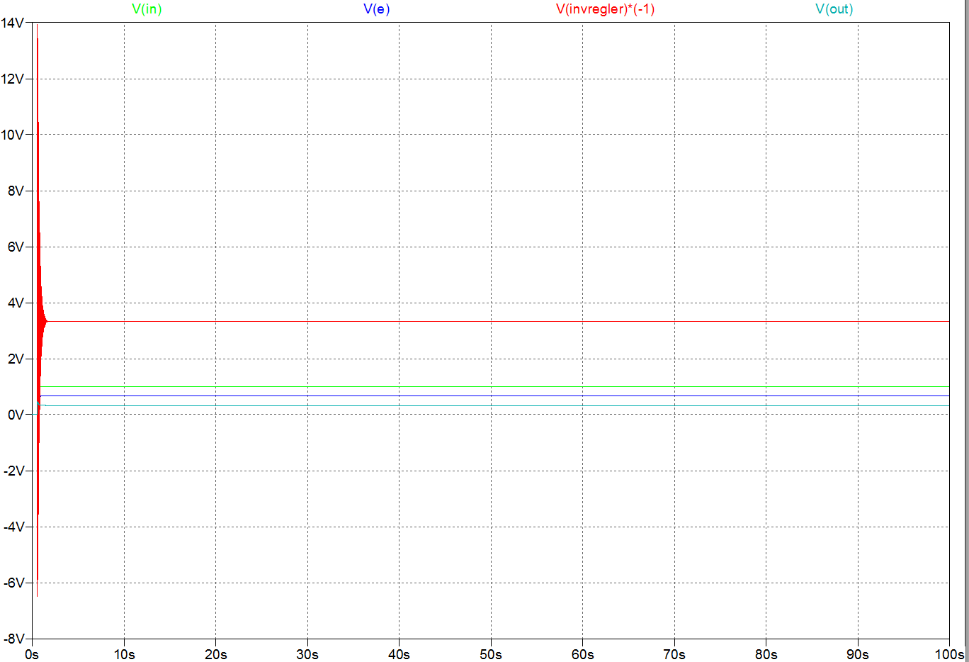Die Schaltung sollte im Regler mit 5 multiplizieren und in der strecke durch 10 dividieren, also ueber alles durch 2 teilen. Was nun sein koennte waeren die Leckstroeme der Caps. Die Caps sind viel zu gross. Wie realistisch die Simulation auch ist... Vom Plot her sind eigentlich nur die ersten drei Sekunden interessant.