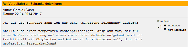 Ok, auf die Schnelle kann ich nur eine "mündliche Zeichnung" liefern: Stellt euch einen temporären kostenpflichtigen Parkplatz vor, der für eine Großveranstaltung auf einem vorhandenen Gelände aufgebaut wird und traditionell mit Chipkarten und Automaten funktionieren soll, d.h. ohne großartigen Personalaufwand. Die Schranken sind schon da und können angesteuert werden. Meine Aufgabe ist das Aufbauen der Kassenautomaten, der "Kartenschlucker" an der Ausfahrt und der Fahrzeugdetektoren für die Schranken. Es gehen drei Bahnen parallel auf die drei Schranken zu. Die Bahnen sind relativ schmal, geschätzt kleiner als drei Meter. Der Versatz der Schranken beträgt ungefähr zwei bis drei Meter. Nach den Schranken münden die drei Bahnen auf eine gemeinsame Ausfahrt mit nur einer Fahrbahn. Die drei parallelen Ausfahrten sind dennoch gefordert, weil die Autofahrer erfahrungsgemäß recht lange mit der Parkkarte herumnesteln oder auch mal Defekte auftreten und eine Spur temporär nicht benutzbar sein kann. Feste Installationen sind mir leider nicht gestattet, mehr als Löcher bohren für einen Sockel ist nicht drin. Es dürfen auch vor dem "Kartenschlucker" keine Säulen oder sonstigen Hindernisse herumstehen, weil diese erfahrungsgemäß innerhalb kürzester Zeit von den Autofahrern abgemäht werden. Was ich als "maximal kniehoch" bezeichnet habe, muss also zwischen dem Kartenschlucker und der Schranke oder direkt im "Schatten" des Schrankensockels stehen, also unerreichbar für einen Autofahrer. Ich hoffe, so wird es deutlicher.