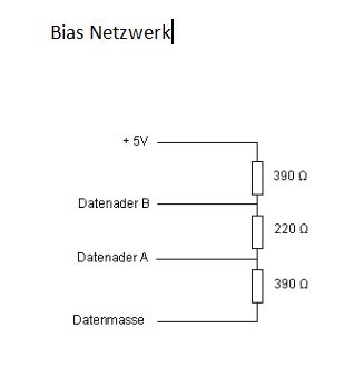 Danke für die Antworten, bei der Terminierung mit den drei Widerständen ist mir noch nicht klar, wie das im aktiven Sendebetrieb funktionieren soll? Wird der Abschlusswiderstand in der Mitte nicht durch die Versorgungsspannung beeinflusst?