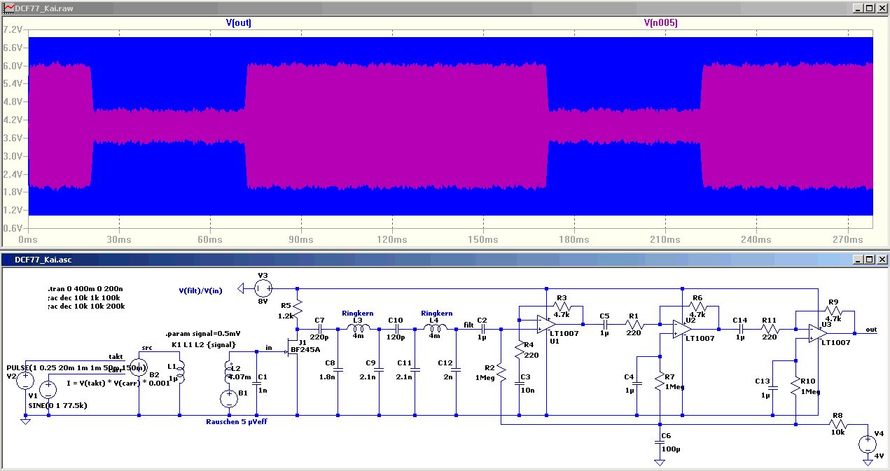 > wenn keine extremen Störer wie ein altes TV Gerät in der Nähe sind Die Störung eines alten TVs befindet sich bei 5 x 15,625 kHz = 78,125kHz. Im Bandplan ist das DCF77 Signal als 77,5 +/-1 kHz definiert. Die TV-Störung befindet sich also noch innerhalb des Seitenbandes und läßt sich mit LC-Filtern nicht so einfach entfernen, ohne auch die Phaseninformation zu verlieren. Wer z.B. in Nähe eines Langwellensenders 153 kHz wohnt, wird das Signal besser filtern wollen. Außerdem gibt es im VLF-Bereich noch weitere Funkdienste, die Probleme verursachen können. Was ist mit Induktionsherden? Falls es sich um ein Einzelstück für den privaten Gebrauch handelt, kann möglicherweise die selektive Ferritantenne reichen. > nicht invertierend aufzubauen ist eine gute Idee Es gibt einen weiteren Vorteil: Die Gegenkopplung kann niederohmiger ausgelegt werden, ohne die Signalquelle zu belasten.