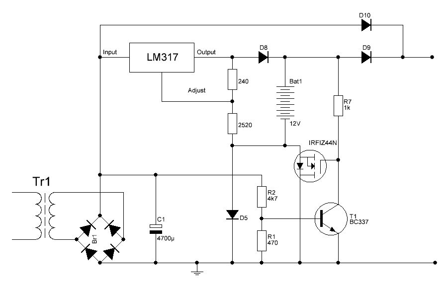 Wieder mal das leidige Thema USV für selbsgebasteltes. Mein Ziel: Ich will mehr als nur den Ladestrom vom Trafo nutzen können, also beispielsweise 3A, somit scheint mir die Lösung Laderegler mit nachgeschaltetem Abwärtswandler nicht tauglich. Ich habe mir die Angehängte Schaltung ausgedacht, muss aber dazu sagen, dass so etwas noch viel neues Land für mich ist. Mein Ansatz: Standard Laderegler (LM317) und umschalten zwischen Akku und Netz per MOSFET. Ich habe diese Schaltung mal aufgebaut und ein bisschen daran gemssen. Im Grunde tut sie was ich wollte. Mit Netzspannung wird der Akku geladen (Spannung hier ca. 13.4V) und ohne wird er entladen. Am Ausgang springt die Spannung natürlich von 15.8V auf ca. 10.5V beim Übergang zu Akkubetrieb, aber da habe ich die Hoffung, dass der nachtgeschaltete Abwärtswandler (ich dachte da an eine Schaltung mit LM2576 wie im Datenblatt) damit fertig wird. Nun die Frage an die Profis: Ist das totaler Blödsinn oder kann man das in etwa so machen?