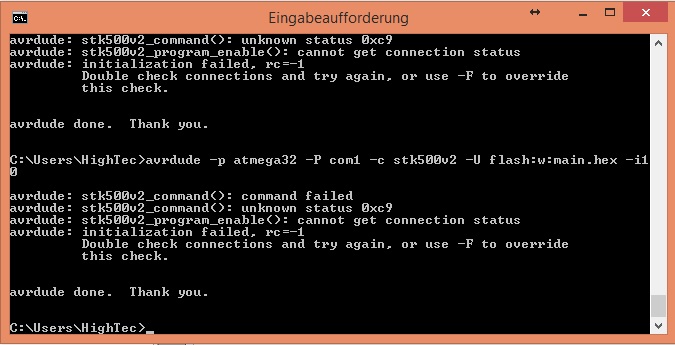 Nabend liebe Forengemeinde, hier ist wieder der blutige Anfänger. Ich habe mir vor kurzen eine kleine Grundausstattung zur AVR-Programmierung angeschafft. Ich habe die Grundschaltung mit einem Atmega32 16PU auf einem Steckbrett aufgebaut und die Verbindungen mehrmals kontrolliert. Auch die Verbindung des USB-ISP Adapters habe ich mehrmals nachkontrolliert. Nun habe ich ein kleines Programm dass lediglich die angeschlossene LED zum leuchten bringen soll. Allerdings bekomme ich keine Verbindung. (Im Anhang seht ihr das cmd Fenster) Ich habe mir schon einige ähnliche Beiträge im Forum angeschaut und die Tipps dort befolgt, und trotzdessen hat sich absolut nichts verändert. Könnt ihr den Fehler entdecken oder liegt es einfach nur am Programmer? Gruß