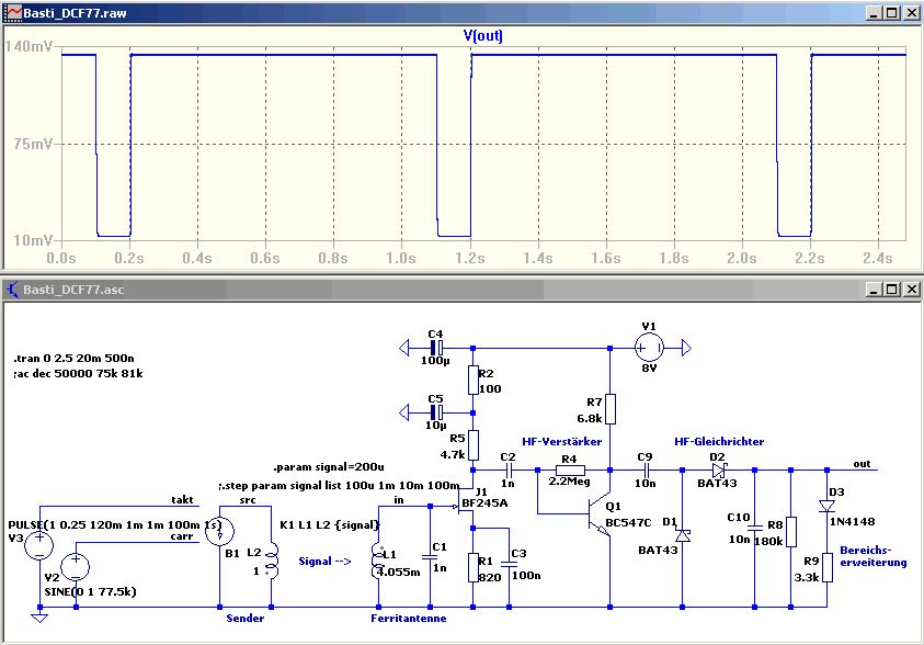 Hallo Basti Ich hab mal einen Schaltungsvorschlag drangehängt. Die Schaltung ist möglichst einfach gehalten. Deshalb muss der Mikrocontroller das Signal am AD-Wandler einlesen und auswerten. Die Schaltung funktioniert prinzipiell von ca. 100µV bis 100mV Antennensignal. > http://www.b-kainka.de/bast582.jpg > kann man mit diesem einfach Transistorradio schon was hören? Das Radio oben funktioniert nur mit Kopfhörer. Es sollte ein Verstärker wie hier nachgeschaltet werden: http://www.b-kainka.de/bast37.jpg Normalerweise läuft eine Funkuhr auch ohne Funkverbindung wie eine normale Quarzuhr weiter. Einmal pro Tag oder Nacht wird der DCF77 Empfänger aktiv und holt die genaue Zeit. Dies dauert 2-3 Minuten. Es wäre also möglich, bei ausgeschaltetem Radio die Antenne für den DCF77-Empfang zu benutzen, um die aktuelle Zeit zu empfangen. Bei der Ferritantenne in meiner Schaltung handelt es sich um eine Langwellenantenne. Mit einem Drehkondensator kann der Bereich von 150...300 kHz empfangen werden. Schaltet man anstatt des Drehkondensators einen 1nF Kondensator parallel zur Spule, liegt die Resonanz bei 77,5 kHz. Es gibt aber auch eine zweite Wicklung für Mittelwelle. Momentan ist auf Langwelle noch der Deutschlandfunk zu empfangen, aber auf Mittelwelle ist tagsüber nicht mehr viel los. Gruß, Bernd Nachtrag: Die von Dir verlinkte Schaltung könnte möglicherweise 1V liefern. > http://www.b-kainka.de/bast582.jpg Das müsst ihr einfach ausprobieren.