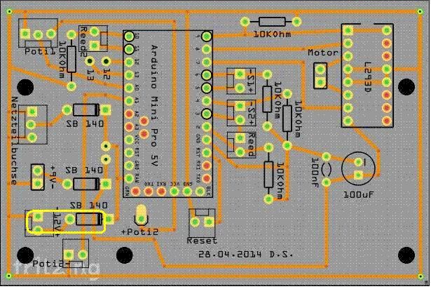 Hallo, beschäftige mich erst seit kurzem mit dem Arduino.Hab viel über die Suchmaschinen im Internet gefunden,wie auch diese interessante Seite. Jedoch leider nicht unbedingt die Antworten zu meinen Fragen. Bin auch in Sachen Elektronik ein Laie. Habe mir für zu Haus etwas gebaut,das von einem kleinen Getriebemotor angetrieben wird.Da ich das noch auf dem Steckbrett in ähnlicher Form habe, würd ich es gern auf eine Platine ätzen lassen. Möchte gerne wissen ob ich es so lassen kann,oder hier Fehler drin sind. Habe da ein Layout mit Fritzing erstellt und es mit angehängt. Der 12V Anschluß mit gelben Rand entfällt vermutlich. Zwischen den beiden Dioden kommen Pinne für einen Jumper,möchte mir frei halten,ob ich den Arduino und den L293D aus der gleichen Spannungsversorgung betreibe. In meiner jetzigen Schaltung auf dem Steckbrett habe ich den L293D über eine 9V Blockbatterie angetrieben mit einem seperatem anderen Motortreiber und den Arduino mit 4*1,5V Mignon. Hatt den Vorteil,das die Geschwindigkeit des Motors recht konstant bleibt. Habe diese Schaltung auch auf einem Steckbrett und die läuft auch soweit. Meine Fragen sind zu den Kondensatoren. Habe im Netz gelesen,das es Sinn macht für einen Motor Kondensatoren davor zu legen. Habe ich auch gemacht,(100uF und 100nF) da ich aber dieses Gerät meist mit Batterien betreiben möchte und es außerdem lange Zeit ca.30min aus ist könnte ich mir diese doch eigentlich sparen,oder nicht? Aus ist gemeint, habe den Arduino mit Narcoleptic in Sleepmodus geschaltet,damit ich den Stromerbrauch reduziere. Zieht den ein Kondensator nicht nach und nach die Batterie leer? Der Motor ist so programiert,das er langsam anläuft und auch langsam ausläuft. Es gibt keine abpruten Richtungsänderungen. Hab noch hier auf der Seite gelesen,das es gut ist Platinen mit Massefüllung zu versehen,wäre es auch für diese sinnvoll? Für Hilfe wäre ich sehr dankbar.