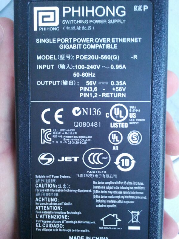 Ein Link auf das Datenblatt wäre hilfreicher gewesen, aber so hat man ja jedenfalls mal den Typ. Das Ding ist also voll IEEE802.3af-konform, d.h. Du bekommst nur Leistung wenn Du am anderen Ende ein Management-Controller verwendest. Du kommst nicht umhin, Dir auf einschlägigen Seiten die PoE-Basics zu erarbeiten. Alle gemachten Aussagen gelten weiterhin, auch die 35V worst-case, je nach Leitungslänge. 19.6W gehen in das Kabel, bei 350mA fällt aber Spannung auf dem Kabel ab, man kann also nicht grundsätzlich mit 56V o.ä. rechnen.