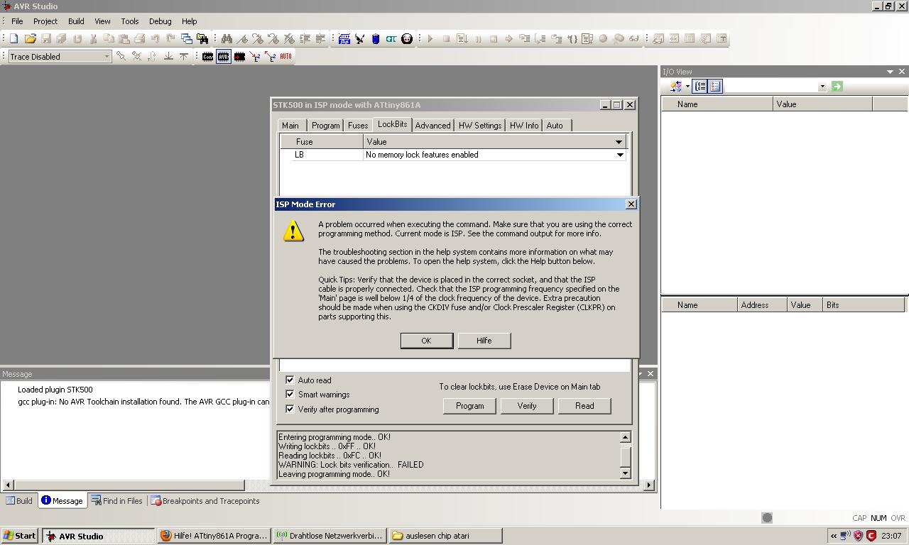 Versuche einen Chip auszulesen aber es kann sein das er gesperrt ist bei Lockbits steht: Further programming and verification disabled Wenn ich es auf "No memory lock features enabled" ändern möchte kommt folgender fehler wie im Dateianhang. Kann man das evtl. umgehen ? bzw. entsperren
