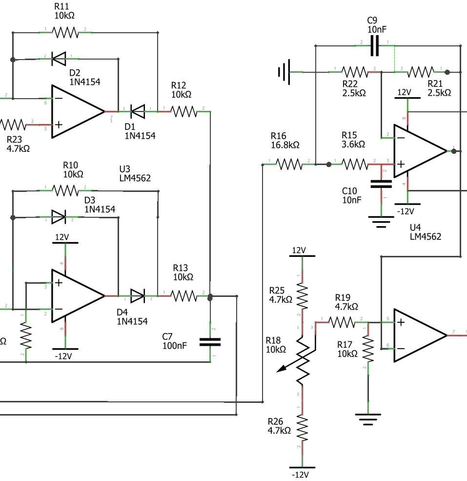 Guten Morgen, @ Bernd: die Kondensatoren an U4 hab ich versuchsweise mal weggelassen, gab keine Änderung. @ Mike: anbei ist der Teil des Dekoders, der Probleme macht. Der IC U4 ist mal aussen vor. Abgegriffen wird im Moment über einen Spannungsfolger nach C7. R12 und R13 blieben gleich, und C7 hab ich von 5nF bis 3uF mal durchvariiert. Bei langsamer Rate funktionierts einigermassen zuverlässig. Nicht so bei 1200Bd. Wäre schön, wenn du mal LTspice drüberlaufen lassen könntest. Gruss jokoel